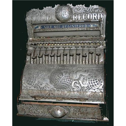 Globe Cash Register.  Ornate, decorative castings and breast plate compliment a quarter sawn oak case.  17" x 20" x 22" T.   Circa early 1900's.