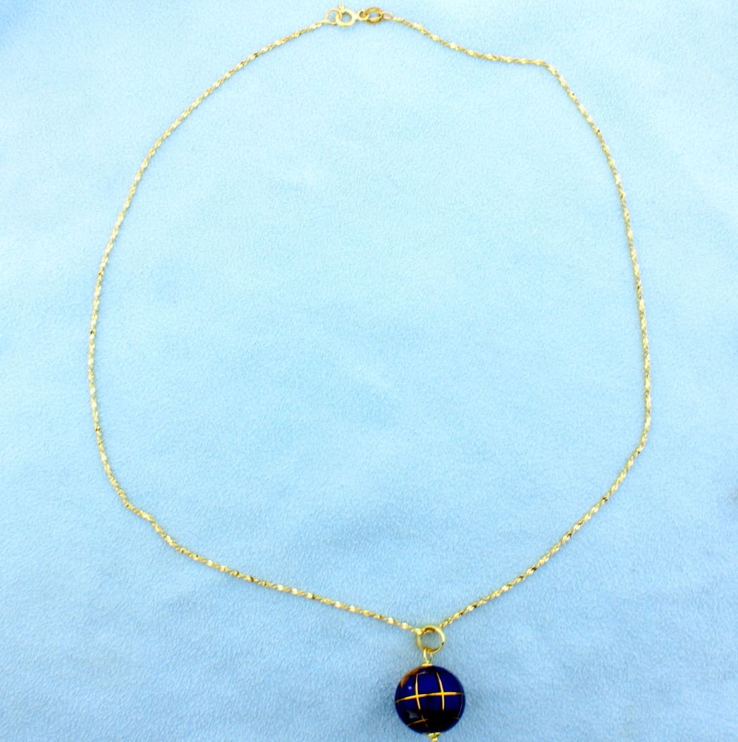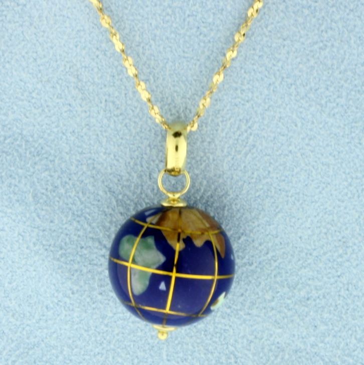 in 14k yellow gold. This globe pendant is 15mm in diameter with map, various gemstones set in blue enamel. 4.8g