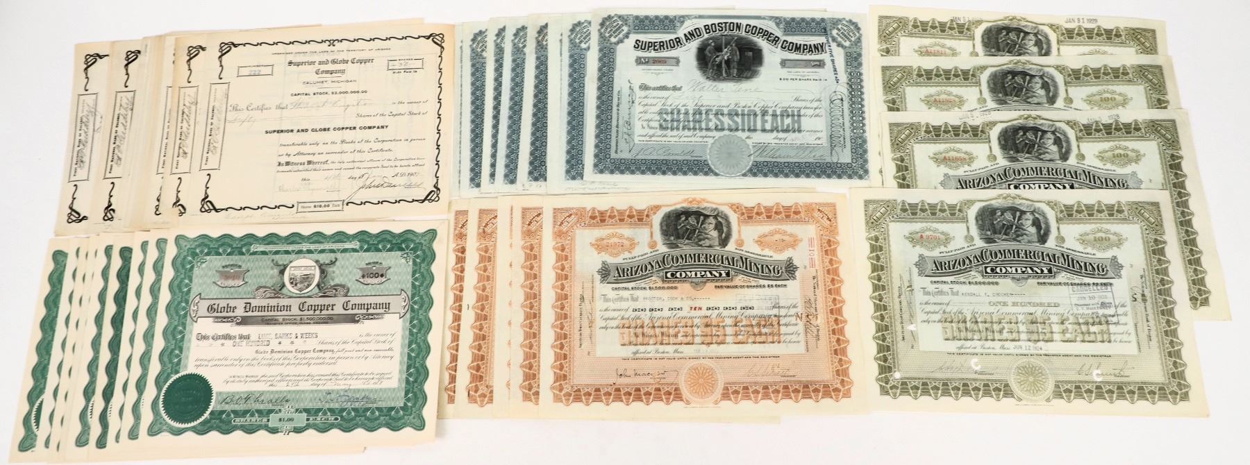 Globe and Miami, Arizona Mining Stocks 3 different companies c.1907-1927 includes Globe Dominion Copper Company (11) Arizona Commercial Mining Company (2 varieties, orange and pea green -qty 9) Superior and Boston Copper Company (2 varieties -29 total) See photos