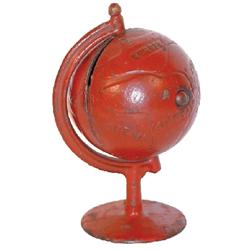 Globe on Arc cast iron bank, Arcade, c.1900-1913 w/most of it's original red paint, 5.25"H.