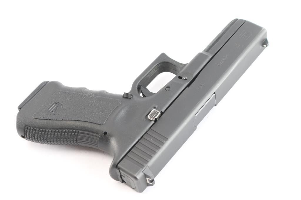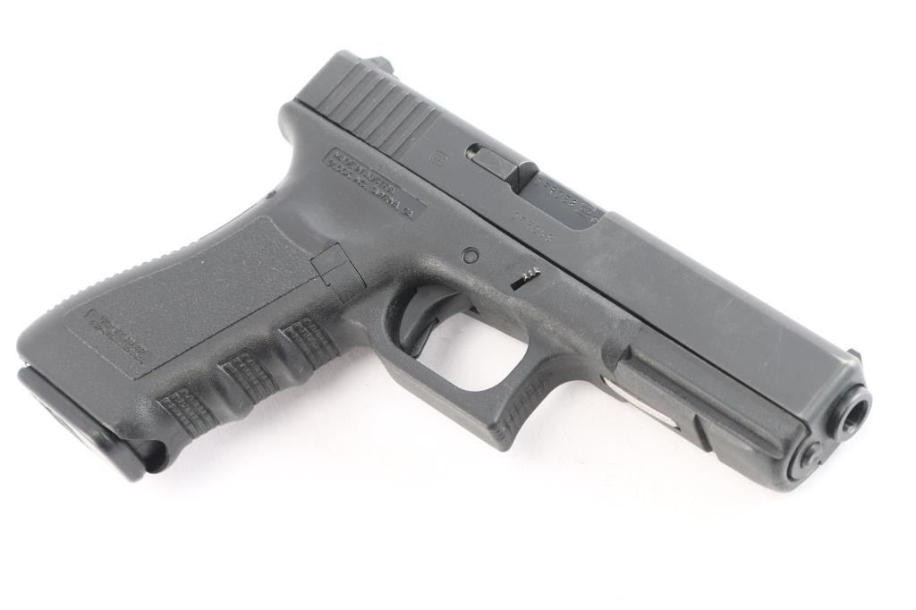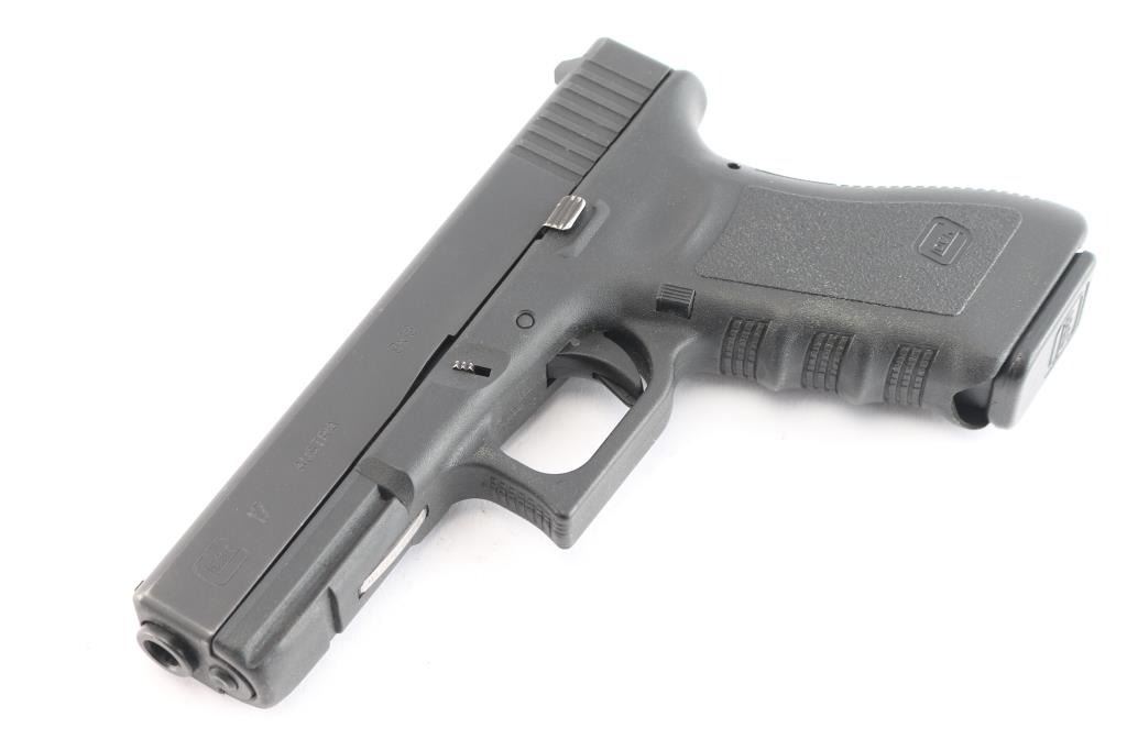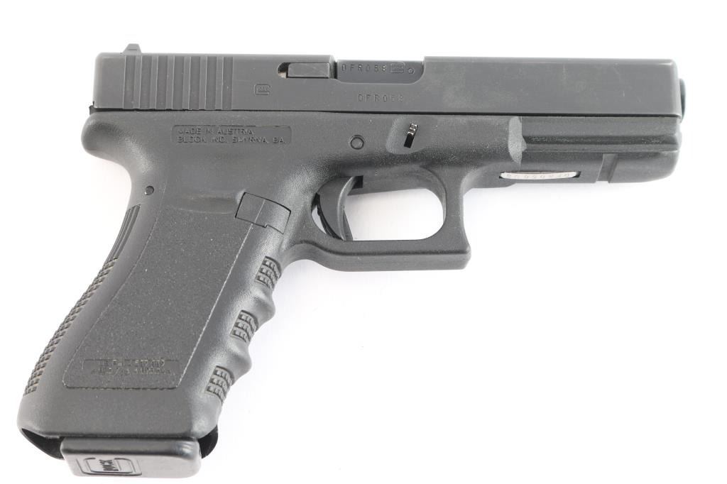 Austrian made semiautomatic full-size pistol chambered for the 9x19mm Luger cartridge. Features a 4.49 inch barrel, black polymer grip frame, matte black finished slide, white dot front, white outline rear sights (factory), manual trigger safety, rail on frame and a textured finger groove grip. Bore is very good, action is smooth. Retains approx. 98% finish with minor edge wear and superficial scratches. Black polymer frame is in excellent condition. Includes one 17rd magazine. Condition is NRA Excellent.