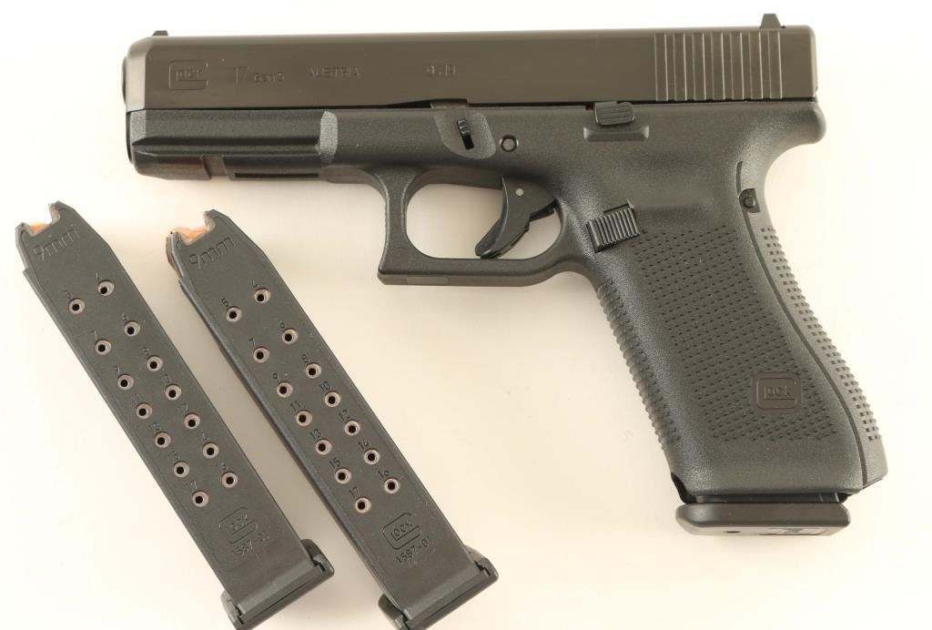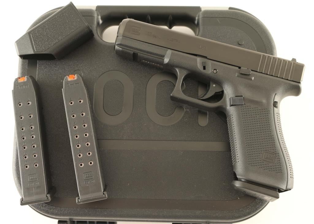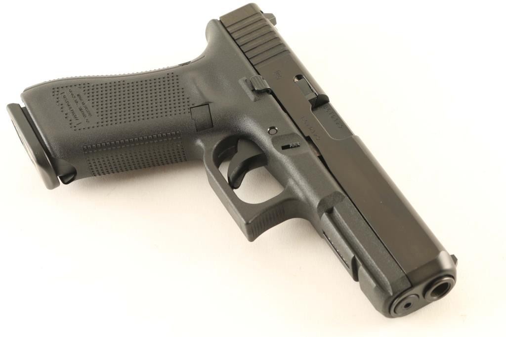 Austrian semiautomatic pistol, imported by Glock Inc, Smyrna GA. Features approx 4.4" barrel, fixed sights with white dot front & white outline rear, striker fired, manual safety in trigger, replaceable backstrap inserts with different size & shape, accessory rail on dust cover. All black finish. Bore is excellent condition. Overall external condition is like new, with little evidence of handling. Includes original "Red Label" factory plastic carry case, manual, cleaning rod & brush, cable lock, three magazines, mag loader, four different backstrap inserts. Condition is NRA excellent - Like New *** Modern Firearm ***