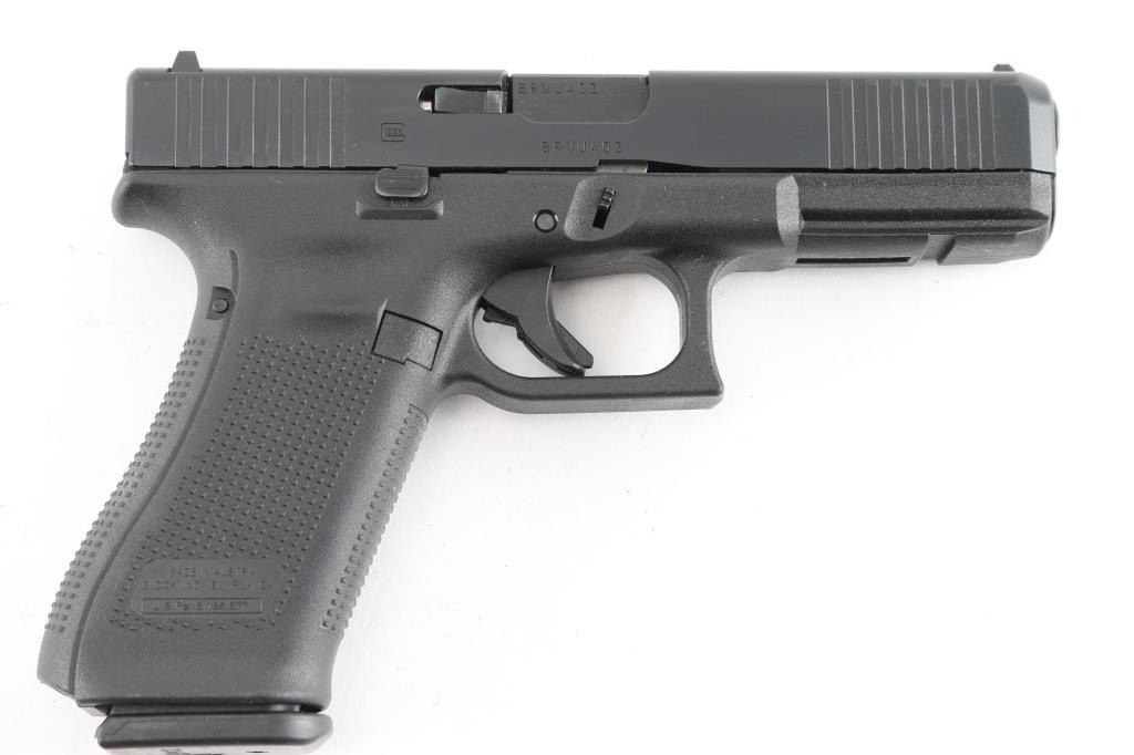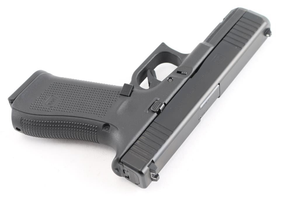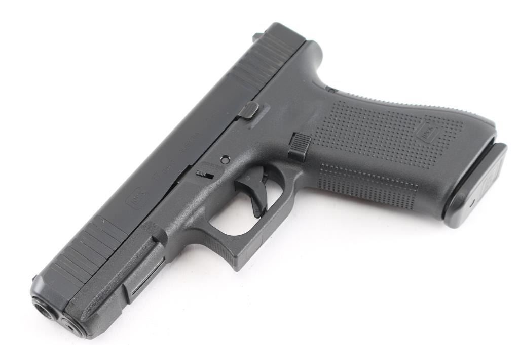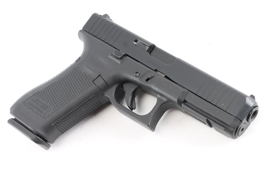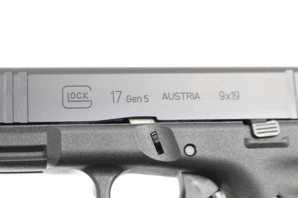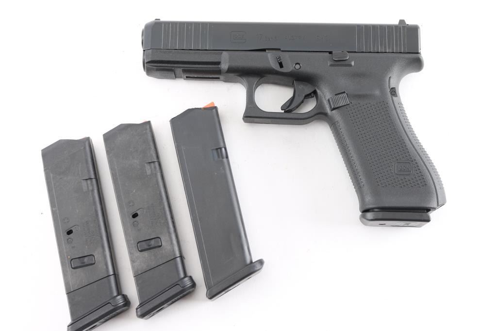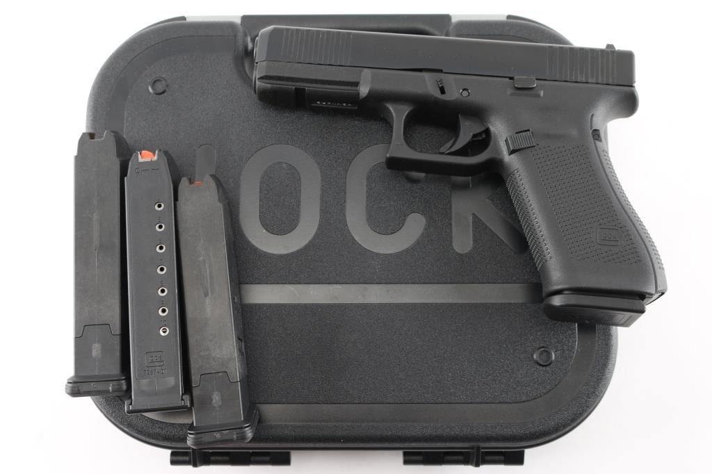 Austrian semiautomatic pistol, imported by Glock Inc, Smyrna GA. Features approx 4.4" barrel, fixed sights with white dot front & white outline rear, striker fired, manual safety in trigger, replaceable backstrap insert, accessory rail on dust cover. All black finish. Bore is pristine. Overall external condition is like new, with little evidence of handling. Includes original factory plastic carry case, manual. Two factory 10 round magazines and two PMAG 10 round magazines, (4) total.