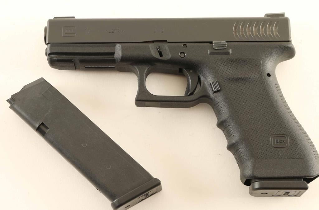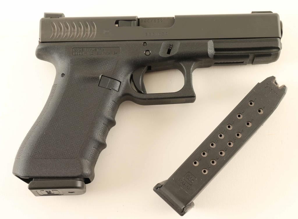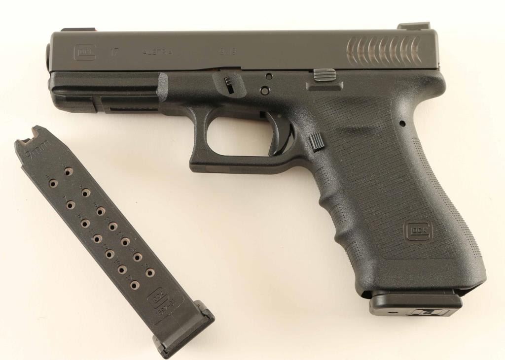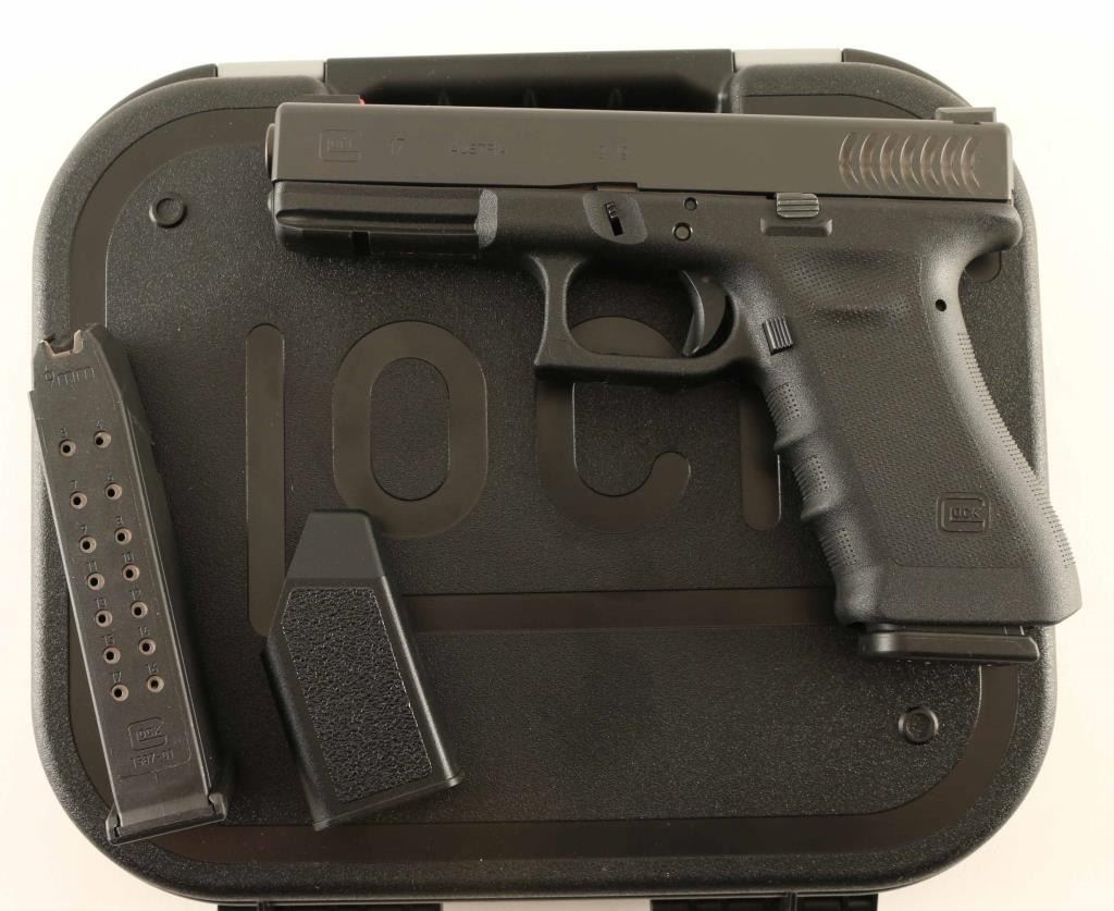 Pistol, Semi-Automatic. Blued slide, black polymer frame/grip. has the RTF treatment on frame/grip. ( rough textured frame) Fish Gill serrations on frame. 4.49" barrel. Bore is excellent/bright. Action locks up tight. Finish is excellent. Comes with two 17-rd magazines, and mag. loader. Original black plastic case. Pervious owner has added a competition trigger spring, and Truglo fiber-optic sights. Red front sight blade, and 2-dot green rear. Pistol is in like new condition. NRA Condition-Excellent. Modern Firearm.