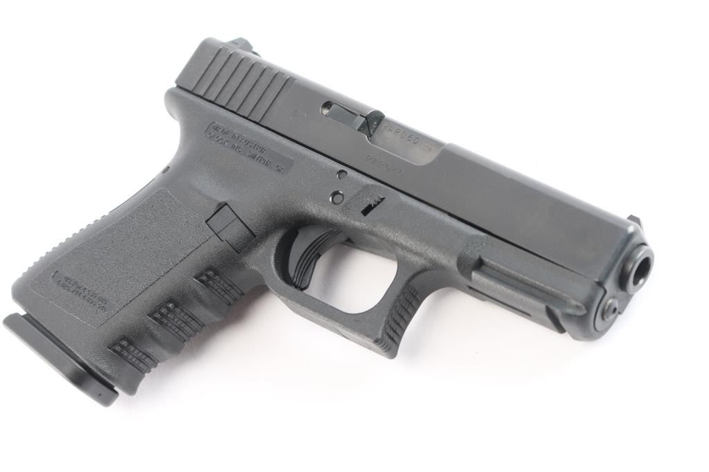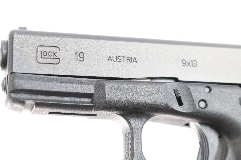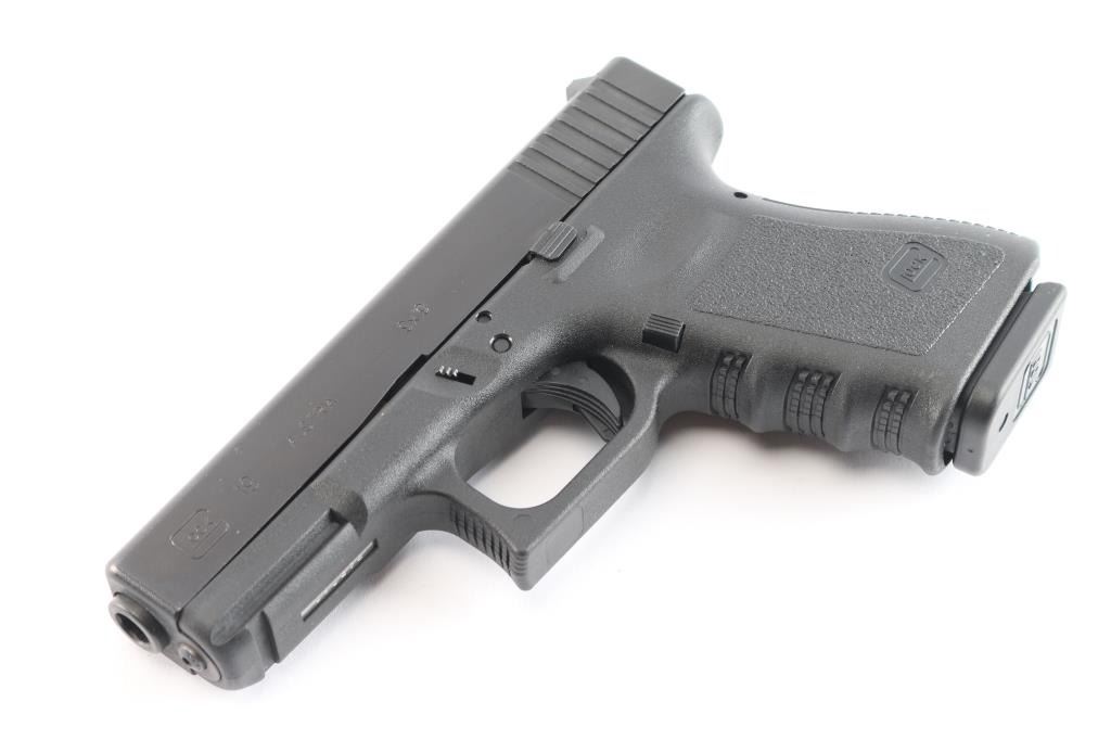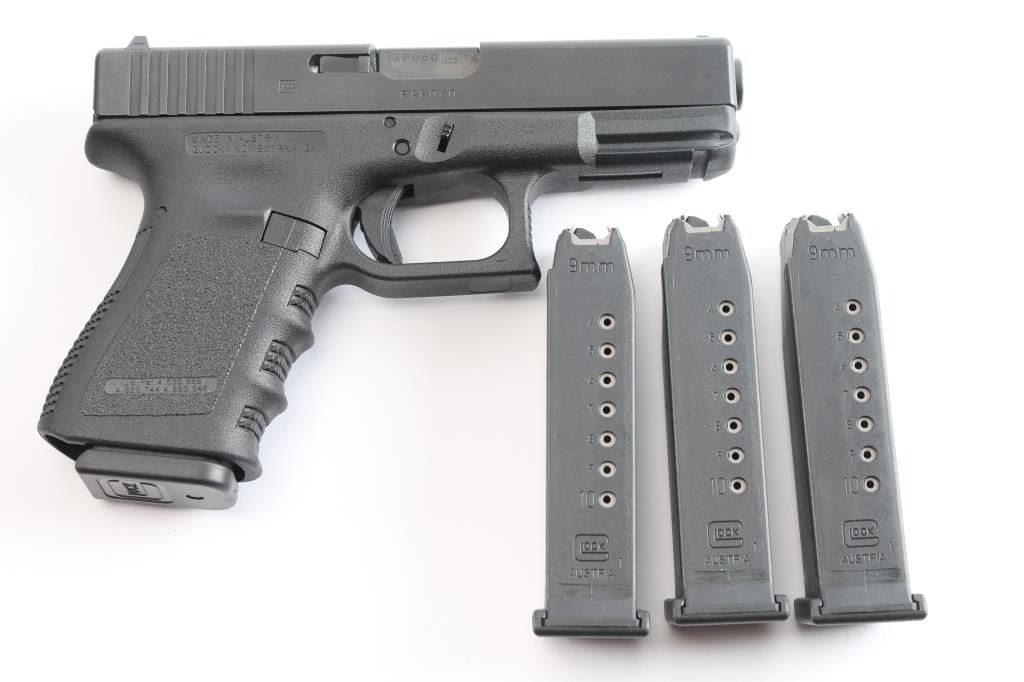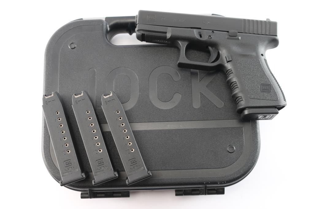 Austrian semiautomatic pistol, imported by Glock Inc, Smyrna GA. Features approx 4" barrel, fixed front sight with white dot, dovetailed adjustable rear sight with white outline, striker fired, manual safety in trigger, extended mag release button. Factory 10-rd magazine. All black finish. Numbers match on frame, slide, barrel. Bore is pristine. Pistol is like new. Includes original factory hard case with cleaning brush, cable lock, magazine loader and three spare factory 10 rd magazines. (4) Total. Matching label.