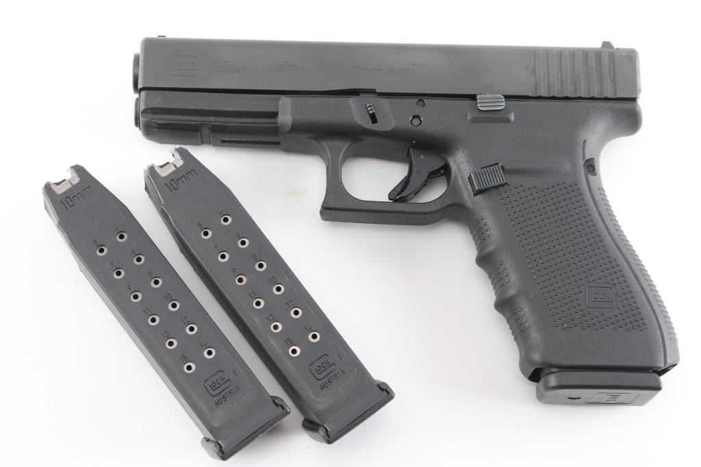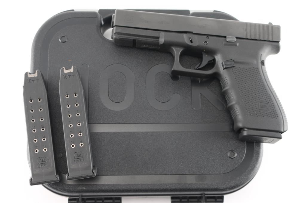 Austrian made full size safe-action semi-automatic pistol imported by Glock Inc, Smyrna GA. Features a black finished slide, 4.61" barrel, white dot front sight, dovetailed rear sight with white outlined square notch, trigger safety, push button magazine release, factory 15 round magazine, and durable black polymer frame with integral accessory rail & finger groove grip. Removable backstrap. Overall condition is like new with few signs of handling or use. Bore is pristine. Comes with its factory case and manual with two 15 rd magazines, (3) total, magazine speed loader, lock, four additional backstraps, cleaning rod and brush.Condition is NRA Excellent - like new***Modern Firearm***