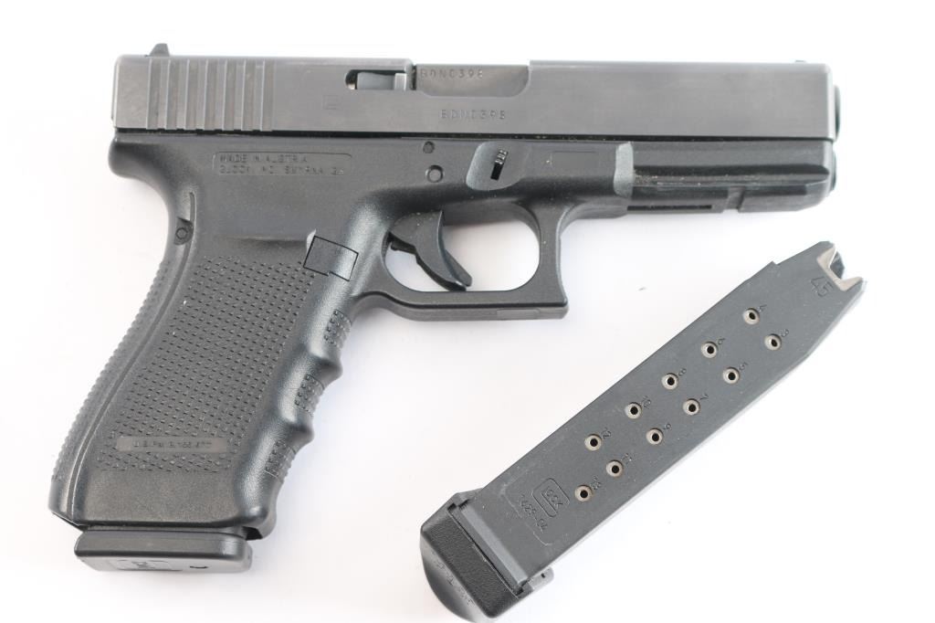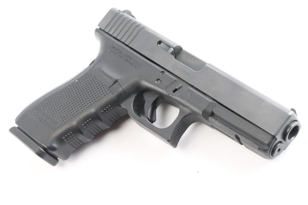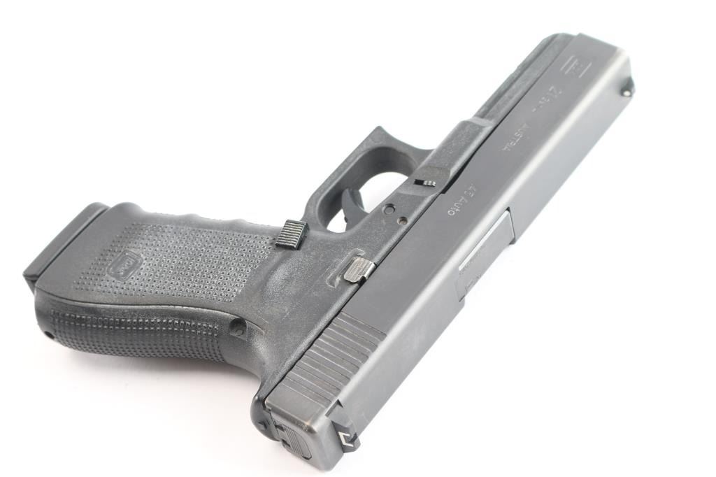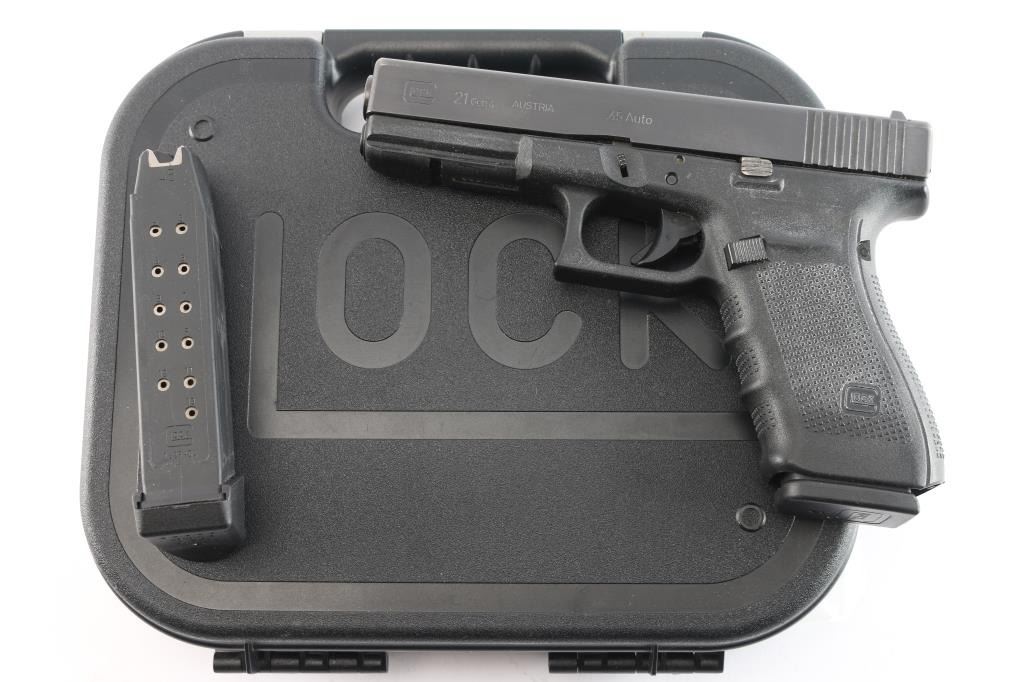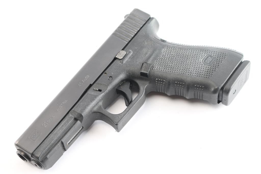 Austrian made full size safe-action semi-automatic pistol chambered in .45 Auto. Features a satin black finish, 4.61" barrel, white dot front sight, dovetailed white outlined square notch rear sight, integrated trigger safety, push button magazine release, 13 round factory magazine, and a durable black polymer frame with integral accessory rail, textured finger groove grip & interchangeable back straps. Pistol exhibits approximately 95% of its original finish showing edge wear and handling marks. The action is mechanically sound, the bore appears excellent but dirty, and the polymer is very good with some handling wear. Includes the original factory hard case with lock and a spare 13 round magazine with a Pearce Grip +2 extension.
