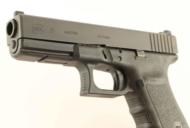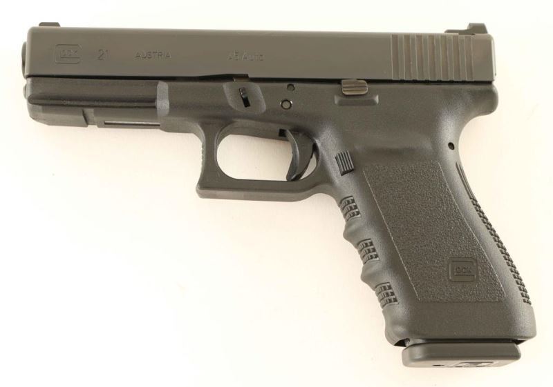 Austrian made full size safe-action semi-automatic pistol chambered in .45 Auto. Features a black finished slide, 4.6" barrel, Heinie Straight Eight Night Sights, trigger safety, push button magazine release, factory 10 round magazine, and a durable black polymer slim frame with integral accessory rail & textured finger groove grip. Includes the original factory hard case with documents, lock, cleaning rod, brush, speed loader, spare magazine and OEM sights. Pistol exhibits approximately 99% of it's black coated finish showing a small bright scuff on the right side of the slide near the muzzle with no other wear observed. Action is smooth, the bore is excellent and polymer is fine. Condition is NRA Excellent in box. ***Modern Firearm***