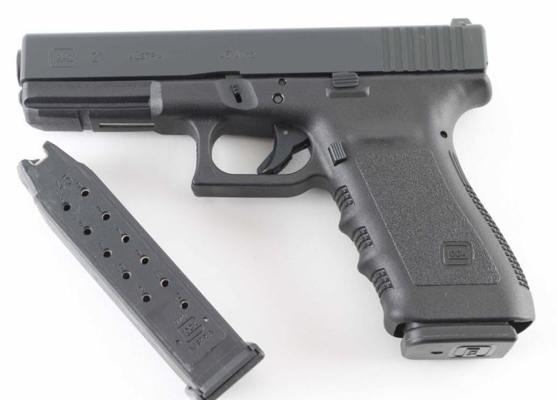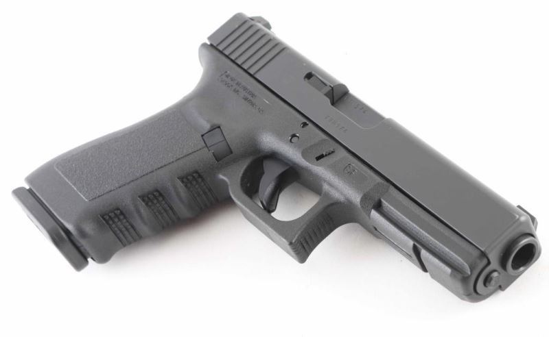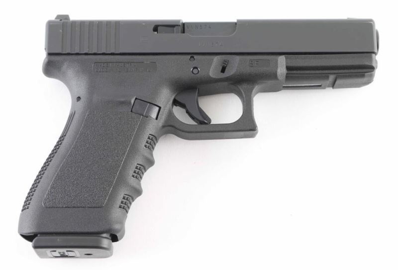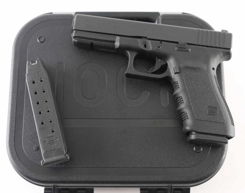 'Short Frame' Austrian semiautomatic pistol, imported by Glock Inc, Smyrna GA. Features approx 4.4" barrel, fixed 3 dot night sights, striker fired, manual safety in trigger, accessory rail on dust cover. All black finish. Night sights have visible glow in dark conditions. The SF version offers increased controllability for shooters with smaller hands. Bore is excellent condition. Overall external condition is like new, with some evidence of handling and use. Includes factory plastic carry case (missing foam lining, no labels remain on case) with cleaning rod & spare magazine (2 mags total). Condition is NRA Excellent *** Modern Firearm ***