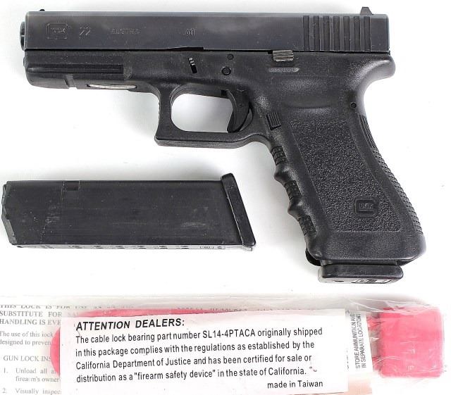 semi automatic pistol, shows very good overall condition, includes 2 magazines and lock. Modern. Est. 375-475