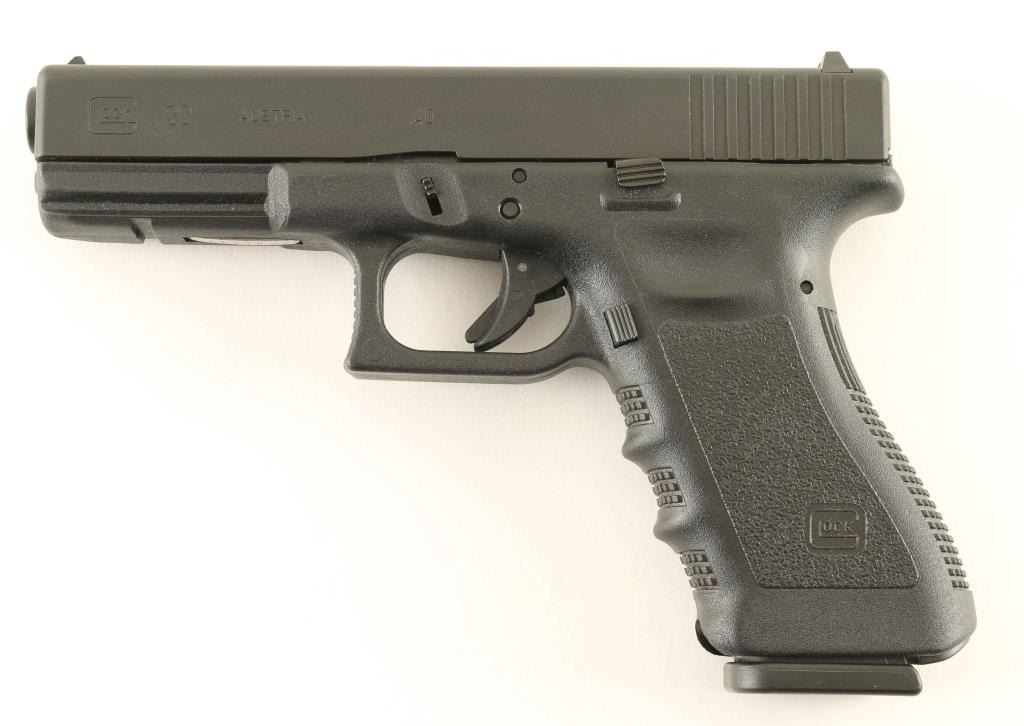 Austrian made full size safe-action semi-automatic pistol chambered in .40 Smith & Wesson. Features a black finished slide, 4.49" barrel, full-length guide rod, white dot front sight, dovetailed rear sight with white outlined square notch, trigger safety, push button magazine release, factory 10 round magazine, and durable black polymer frame with integral accessory rail & finger groove grip. Pistol exhibits approximately 95% of it's black coated finish showing scattered handling marks/scratches. Action is smooth, the bore is pristine and the polymer is fine. Condition is NRA Very Good+++. ***Modern Firearm***