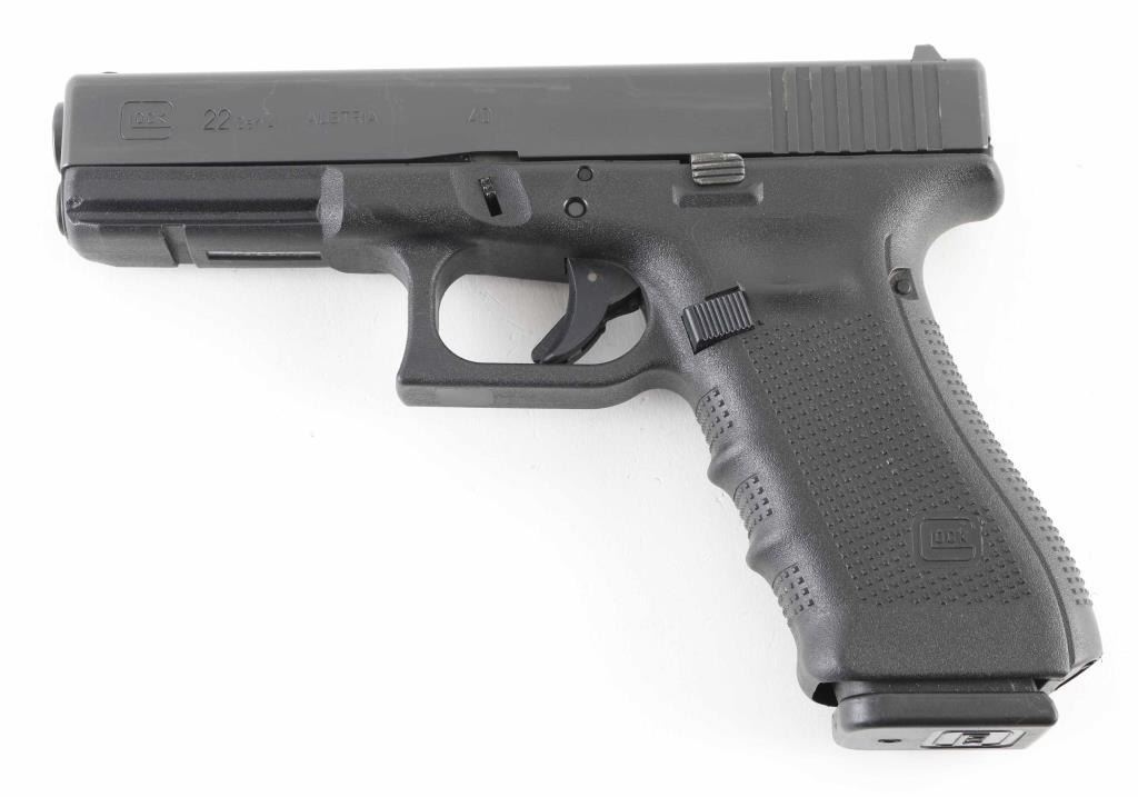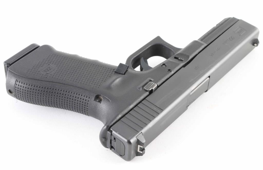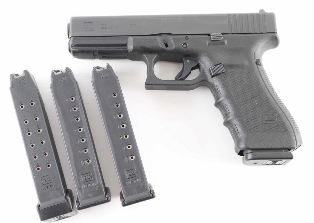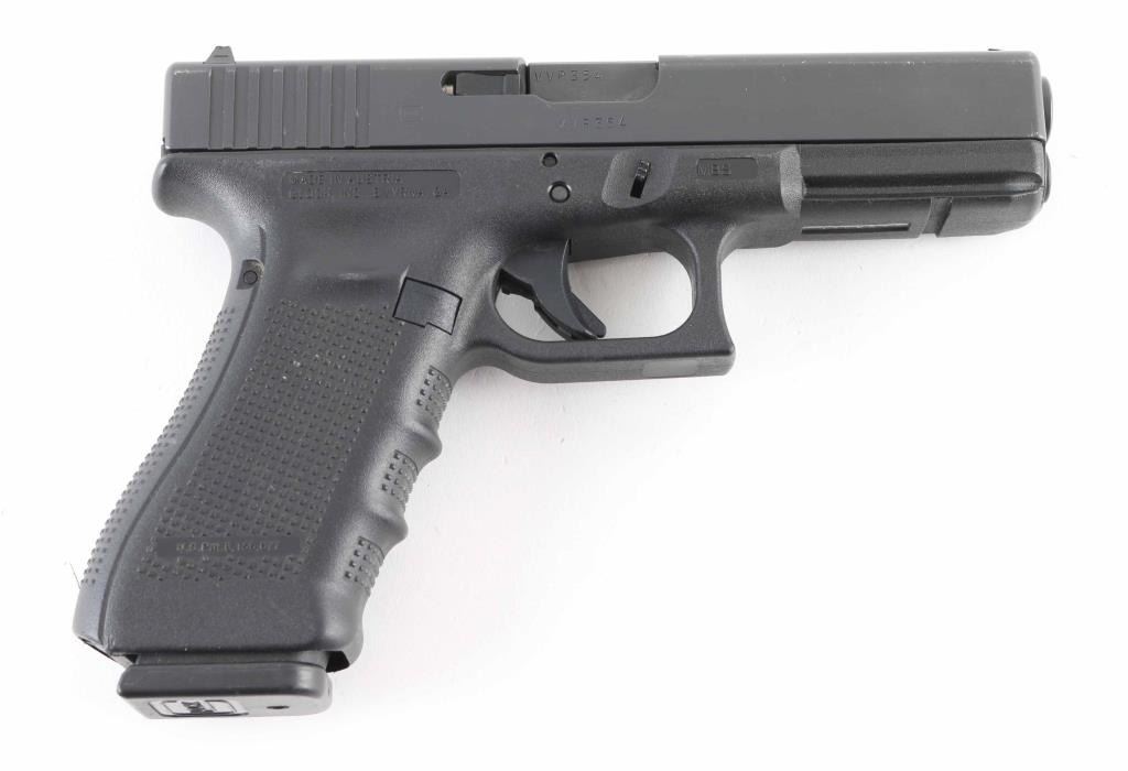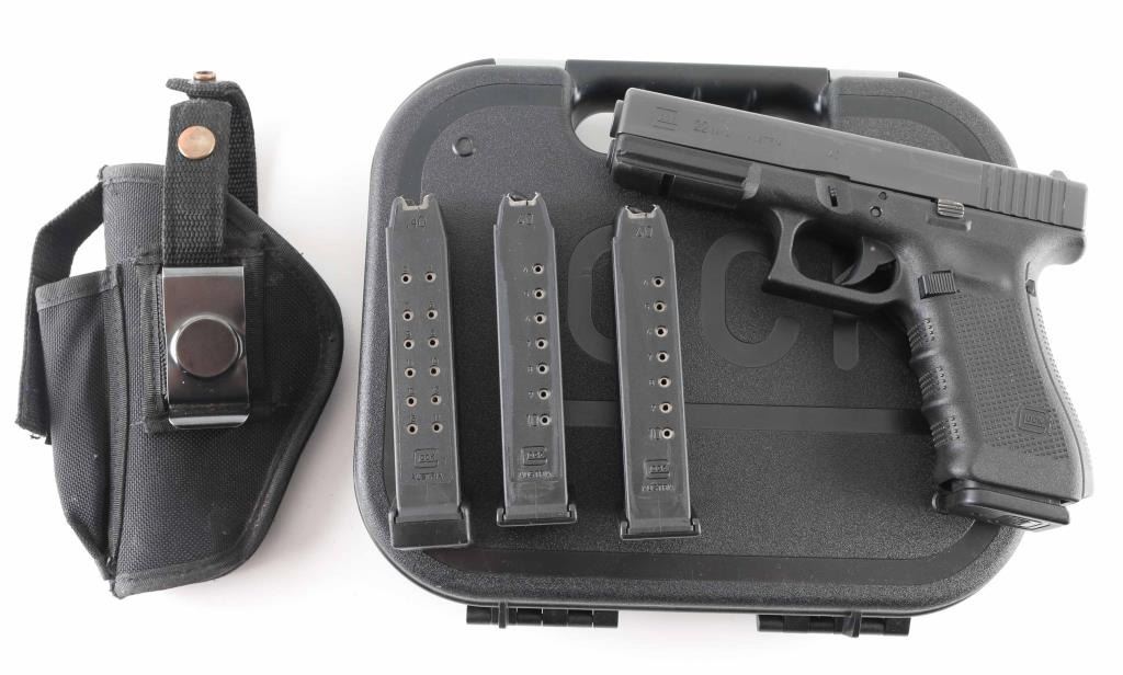 Austrian made full size safe-action semi-automatic pistol chambered in .40 Smith & Wesson. Features a black finished slide, 4.49" barrel, white dot front sight, dovetailed rear sight with white outlined square notch, trigger safety, large reversible push button magazine release and durable black polymer frame with integral accessory rail. Gun shows some signs of handling but looks good. Bore is bright. Comes with two (4) 15 round magazines and canvas holster with mag pouch, black polymer Glock factory box & paperwork, extra backstraps. NRA Very Good Modern Firearm