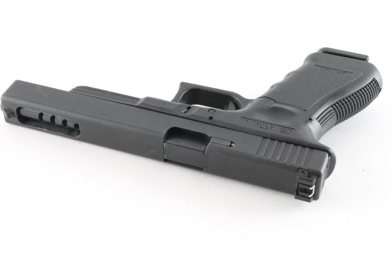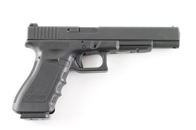 Austrian made semi-automatic competition pistol imported by Glock, Smyrna GA. Features a black polymer frame, lightened long slide with matte black finish, 6" ported barrel, front blade sight with white dot, square notch rear sight in dovetail with white outline, trigger safety, extended push button magazine release. Bore is very good condition. Overall finish on the frame, slide and barrel is good with some signs of use at the muzzle. There is what appears to be a build up of grease (?) discharged gas and powder, from the ported barrel,at the cut out of the slide and covering the front sight. It needs a good cleaning. Comes with one (1) 10 round Glock magazine. Condition is NRA Very Good