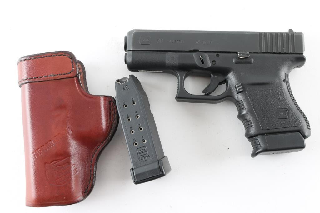 Austrian semiautomatic pistol, imported by Glock Inc, Smyrna GA. Features approx 3.75" barrel, white dot front & white outline rear sights, striker fired, manual safety in trigger. All black finish. Bore is excellent condition. Retains 90% finish on slide, with edge losses. Polymer frame is very good condition. Includes (2) magazines, very good condition Don Hume leather IWB holster. Condition is NRA Very Good++ *** Modern Firearm ***