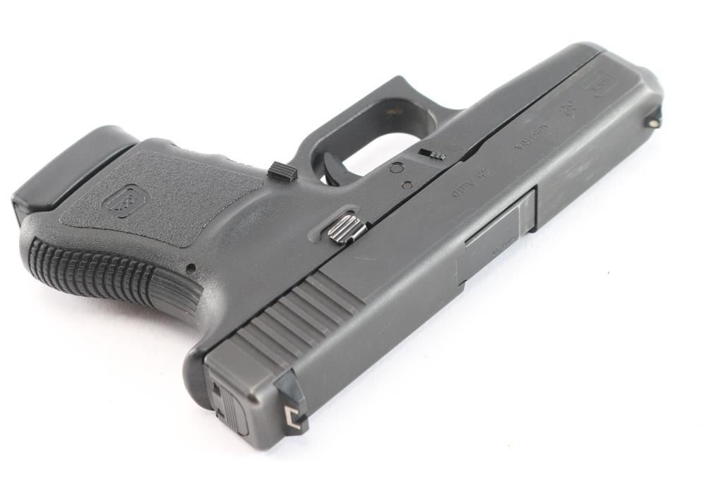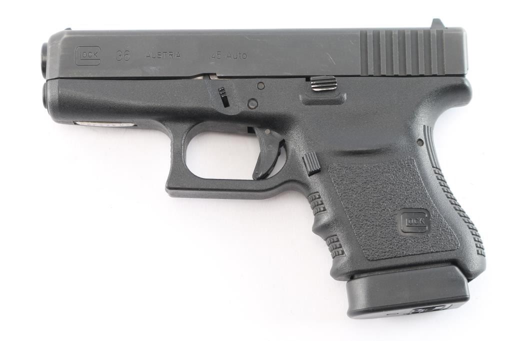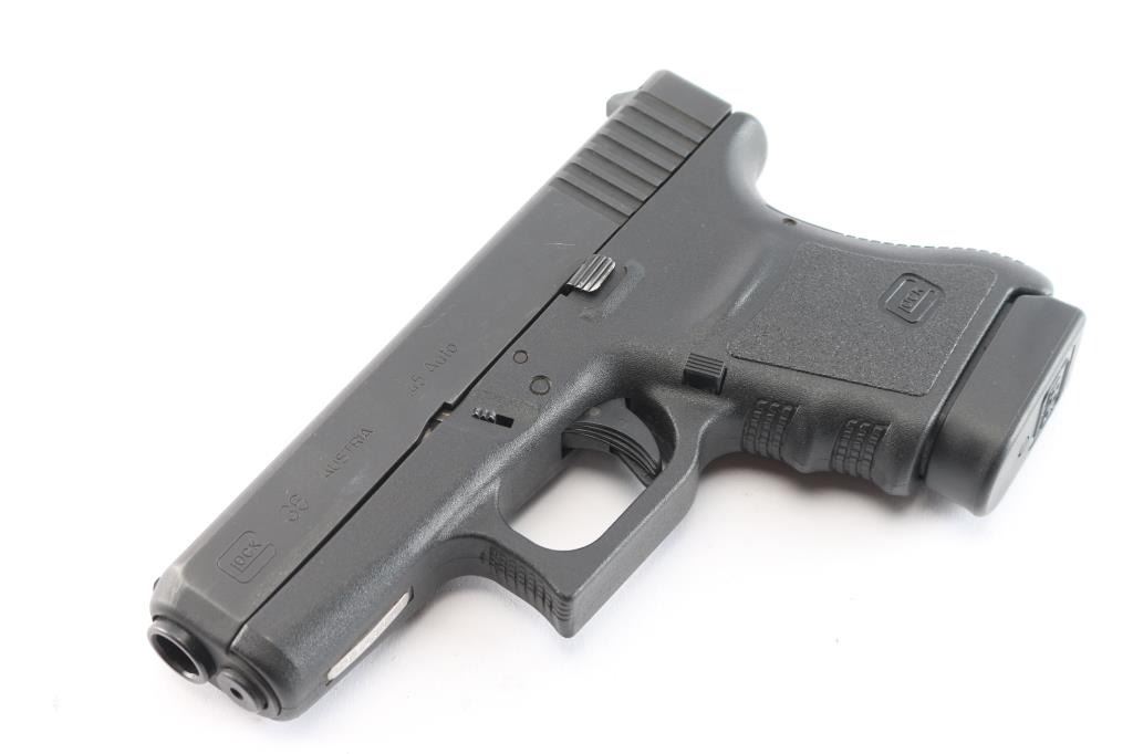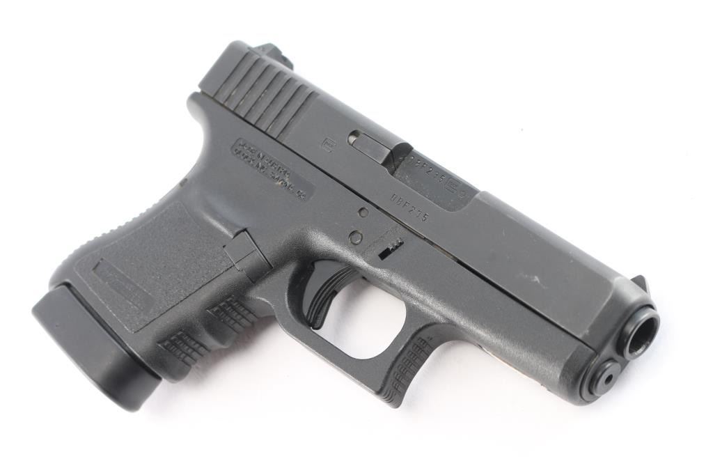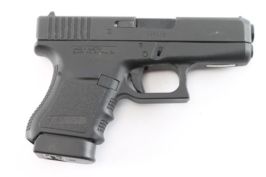 Austrian made sub-compact safe-action semi-automatic pistol imported by Glock, Smyrna GA. Features a black finished slide with beveled front edge on slide, 3.78" barrel, white dot front. and white outline notch rear sights, trigger safety, push button magazine release, factory 6 round magazine, slim black polymer frame with textured finger groove grip. Bore is excellent/bright. Retains 99% finish with minor edge losses. Like new condition.