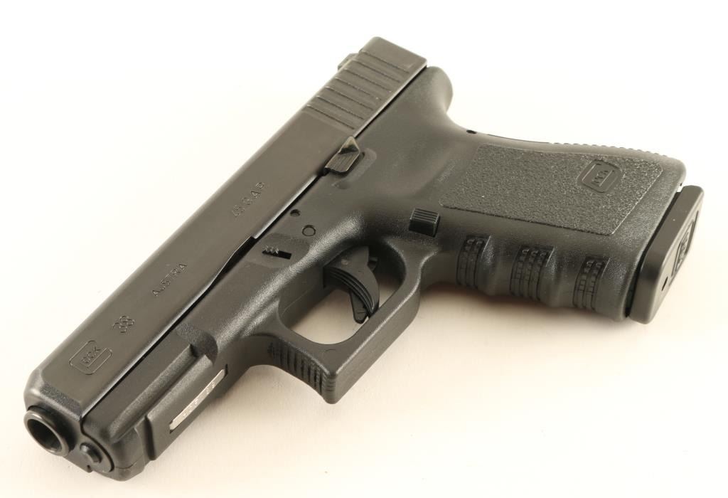 German semiautomatic pistol chambered for the 45 GAP (Glock Automatic Pistol) cartridge. Features approx. 4 inch barrel, 3 dot night sights, manual trigger safety. Bore is excellent. Metal parts retain over 98% black finish. Black polymer frame is in excellent condition, has accessory rail on dust cover. Night sights are dim. Includes factory black plastic carry case with paperwork, spare 8 round magazine (2 total), two 10 round magazines, magazine loader, cable lock. All magazines are Glock factory. Included ammo is Magtech Guardian Gold 185 grain JHP; one full 20 round box, one partial box with 10 rounds and 10 pieces of fired brass. Observed numbers match. Condition is NRA Excellent - Like New ***Modern Firearm***