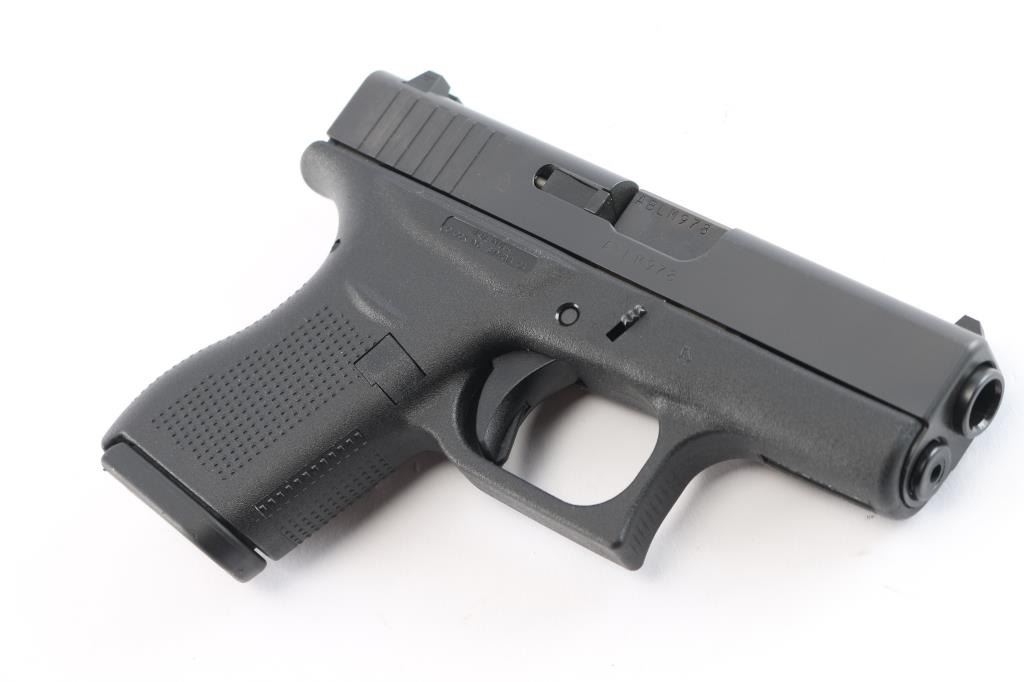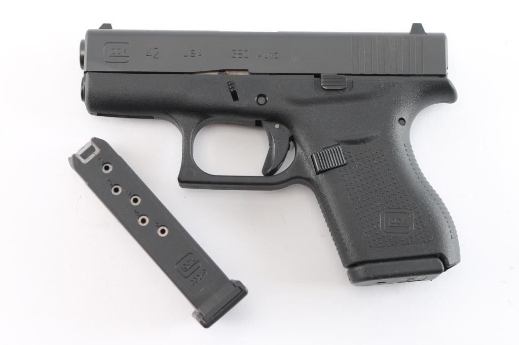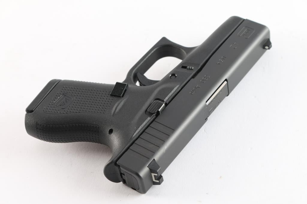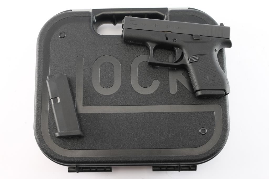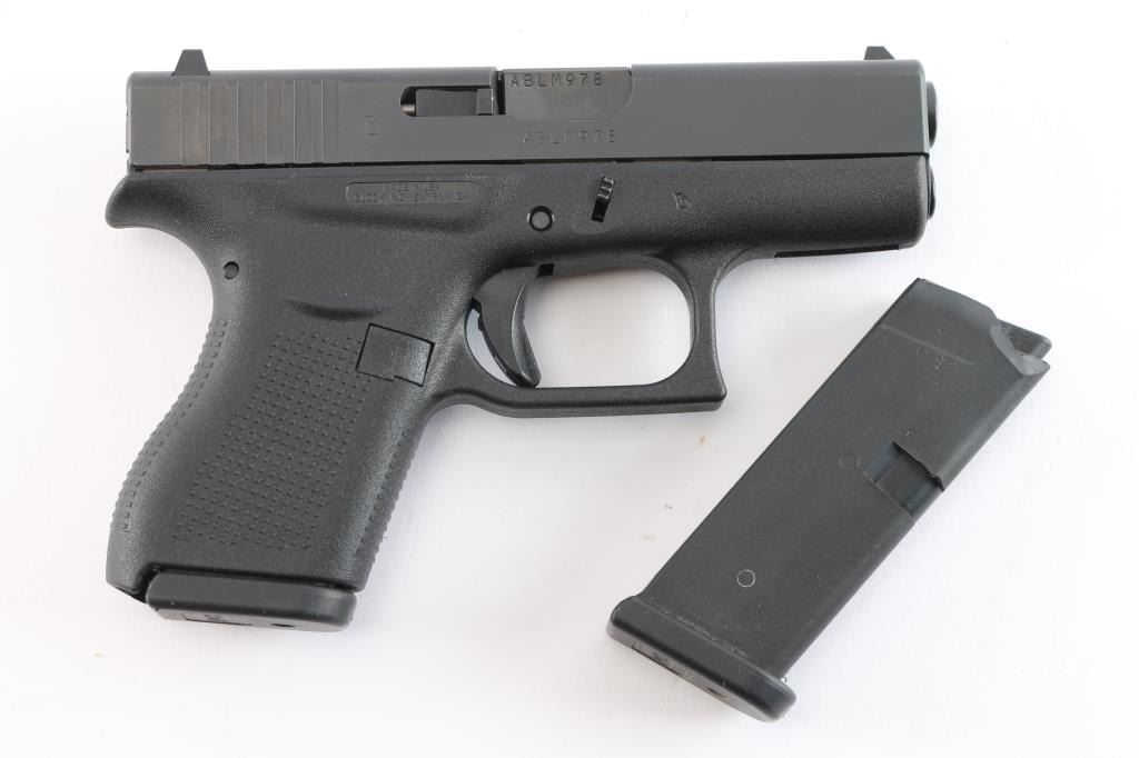 American made compact semiautomatic pistol by Glock Inc, Smyrna GA. Features approx 3.2" barrel, fixed sights with white dot front & white outline rear, striker fired, manual safety in trigger, slim grip with single stack magazines. All black finish. Bore is excellent/bright condition. Overall external condition is Excellent, with very minor signs of handling. Includes original "Blue Label" factory plastic carry case, manual, spare factory 6-rd magazine. (2) Total.