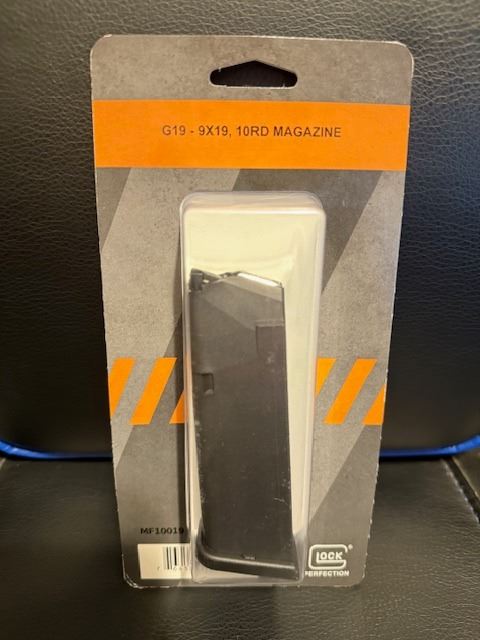 Factory original Glock G19 9mm 10-round magazine, still sealed in the original Glock packaging. This is a Genuine OEM part, not aftermarket.