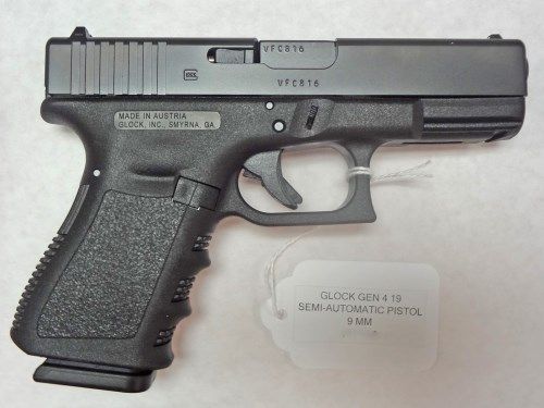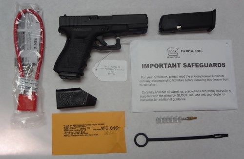 Glock Gen 4 19 Semi-Auto Pistol 9MM. Finish-Black Matte, Action-Safe, Capacity-15+1, # of Mags-3, Safety-Safe Action-3 Separate Auto Safeties, Sights-Fixed, Barrel Length-4.02", Overall Length-6.85, Weight-21.16 oz, Packaging-Black Plastic Case, Features-Mag Loader, Cleaning Rod and Brush, Interchangeable Backstrap, Reversible Mag Catch, Receiver-Polymer with Finger Grooves. Est 500.00-550.00