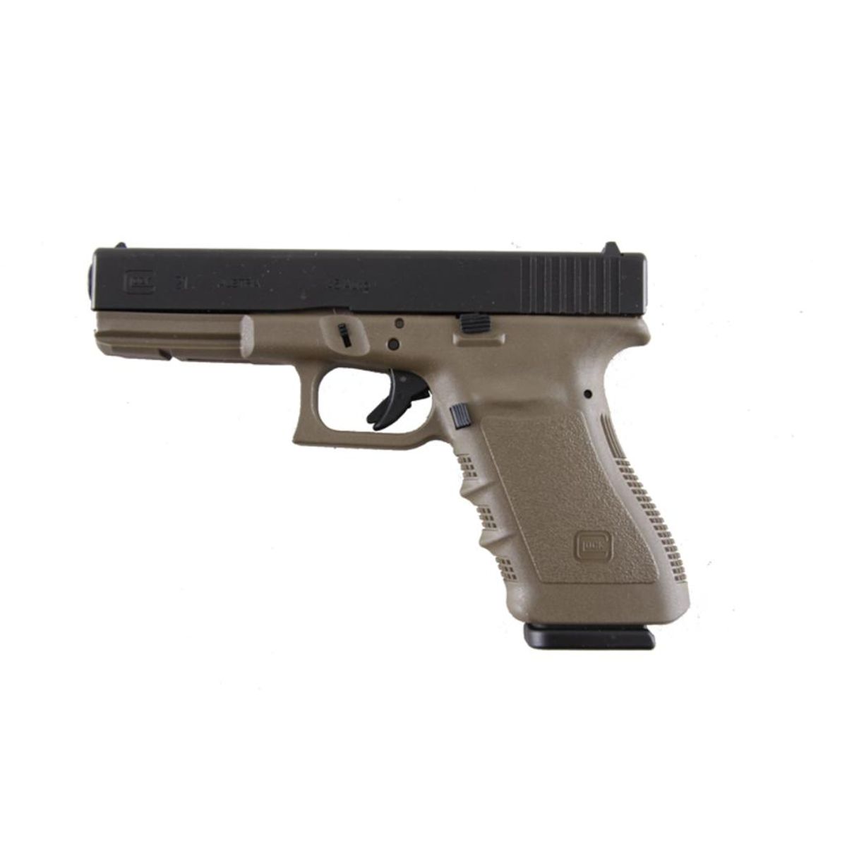 Glock Mdl 21 Cal .45acp SN:KDG601 Double action only 13 shot semi-auto pistol with OD Green polymer frame and matte black steel slide made in Austria. OD Green molded in grips with finger grooves and accessory rail at the muzzle, 4 1/2" barrel with drifDouble action only 13 shot semi-auto pistol with OD Green polymer frame and matte black steel slide made in Austria. OD Green molded in grips with finger grooves and accessory rail at the muzzle, 4 1/2" barrel with driftadjustable sight, good bore and action. Included in black plastic carry case with gun lock, instruction sheet cleaning tools, and speed loader. Condition: Near new with no sign of use. 2magazines.
