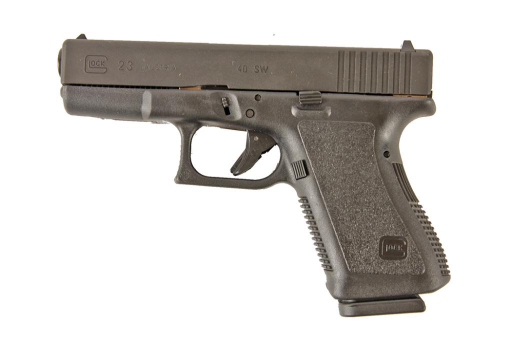 Glock Mdl 23 Cal .40S&W SN:ANS143US Double action only semi-auto polymer frame pistol made in Austria, steel slide, black polymer frame with integral pebbled grip frame, 4" barrel, white dot/white outline sights. Condition: Near new and has been fireDouble action only semi-auto polymer frame pistol made in Austria, steel slide, black polymer frame with integral pebbled grip frame, 4" barrel, white dot/white outline sights. Condition: Near new and has been fired. Includes black plastic storagcase with two magazines.