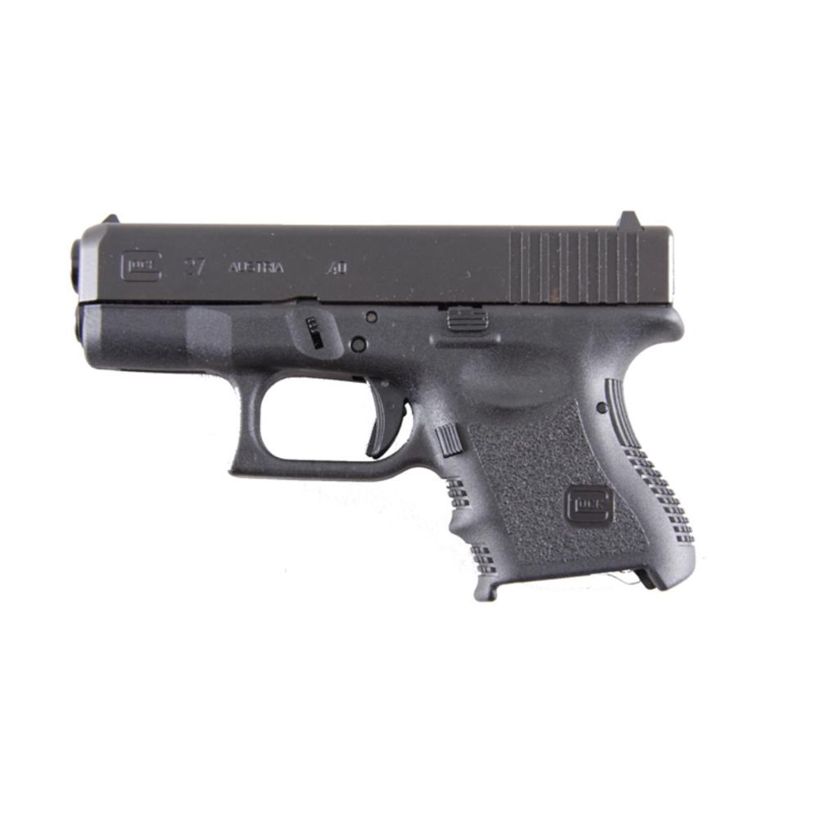 Glock Mdl 27 Cal .40S&W SN:LYR474 Sub compact double action only 9 shot semi-auto pistol made in Austria. Polished black slide and black polymer frame with molded in finger groove grips. 3 1/4" barrel with drift adjustable white outline sight, good boreSub compact double action only 9 shot semi-auto pistol made in Austria. Polished black slide and black polymer frame with molded in finger groove grips. 3 1/4" barrel with drift adjustable white outline sight,good bore and action. In black plastic carry case with cleaning kit, gun lock, and instructions. Condition: Near new with no sign of use. No magazine.
