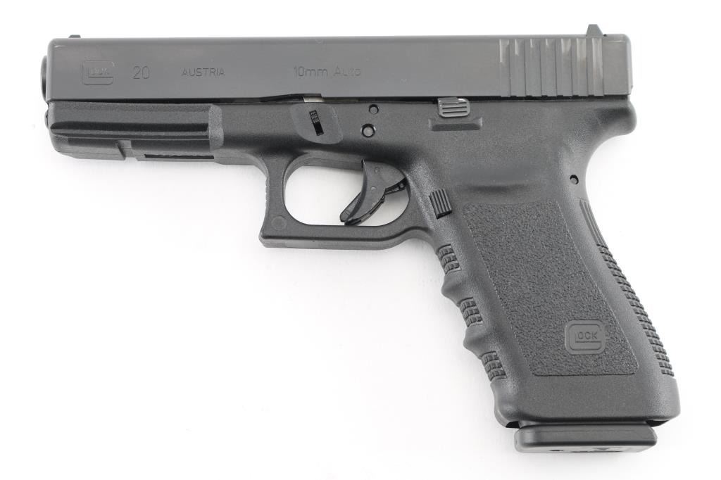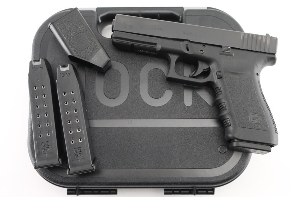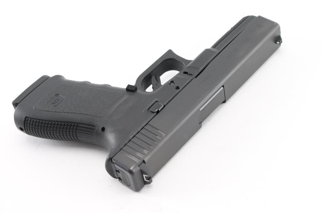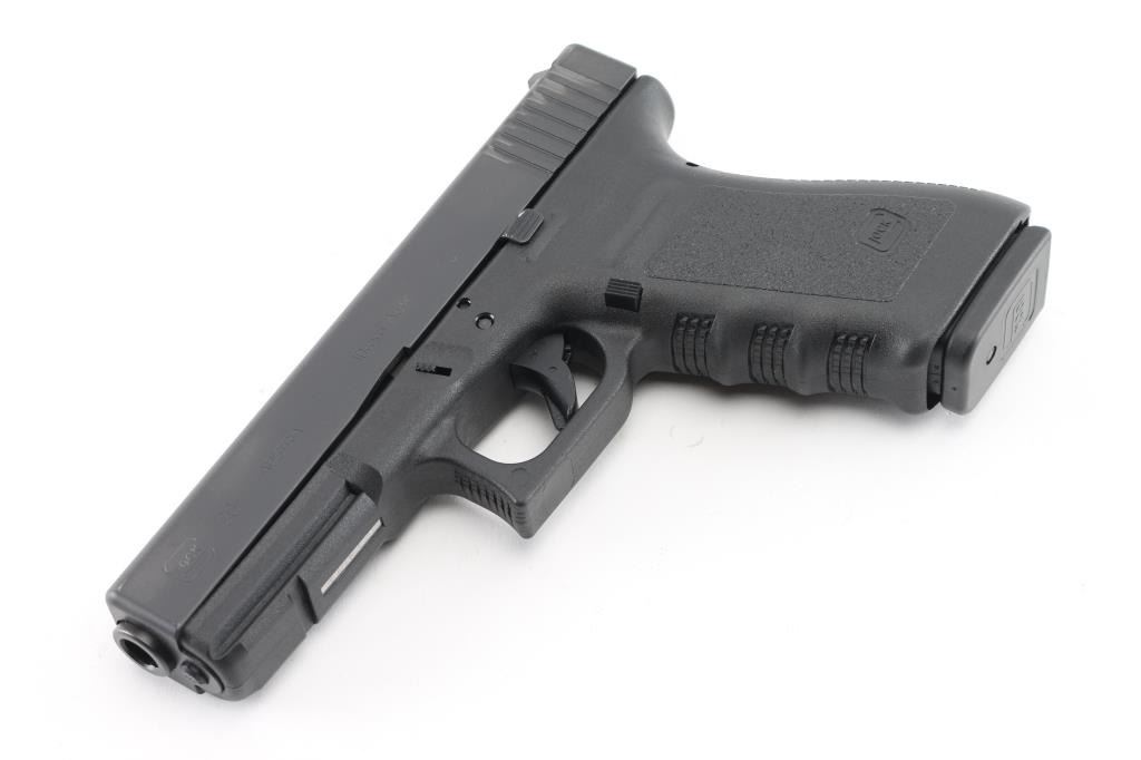 Austrian made full size safe-action semi-automatic pistol imported by Glock Inc, Smyrna GA. Features a black finished slide, 4.61" barrel, full-length guide rod, white dot front sight, dovetailed rear sight with white outlined square notch, trigger safety, push button magazine release, factory 15 round magazine, and durable black polymer frame with integral accessory rail & finger groove grip. Overall condition is like new with few signs of handling or use. Bore is pristine. Comes with its factory case with two 15 rd magazines, (3) total, magazine speed loader, cleaning gear, and documents. Condition is NRA Excellent - like new. Modern Firearm.