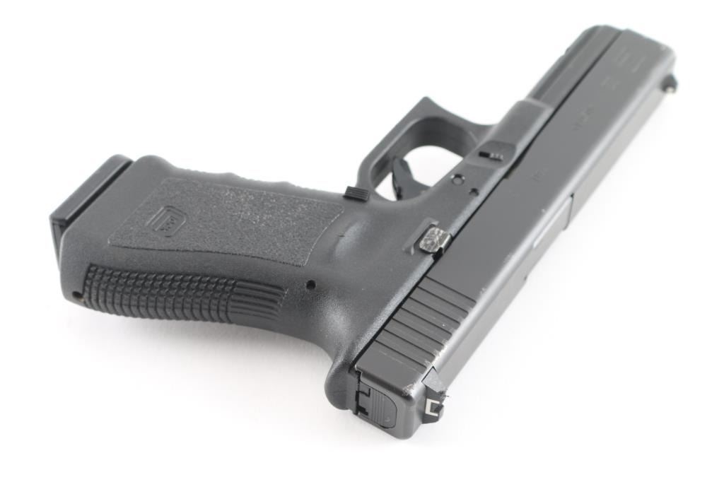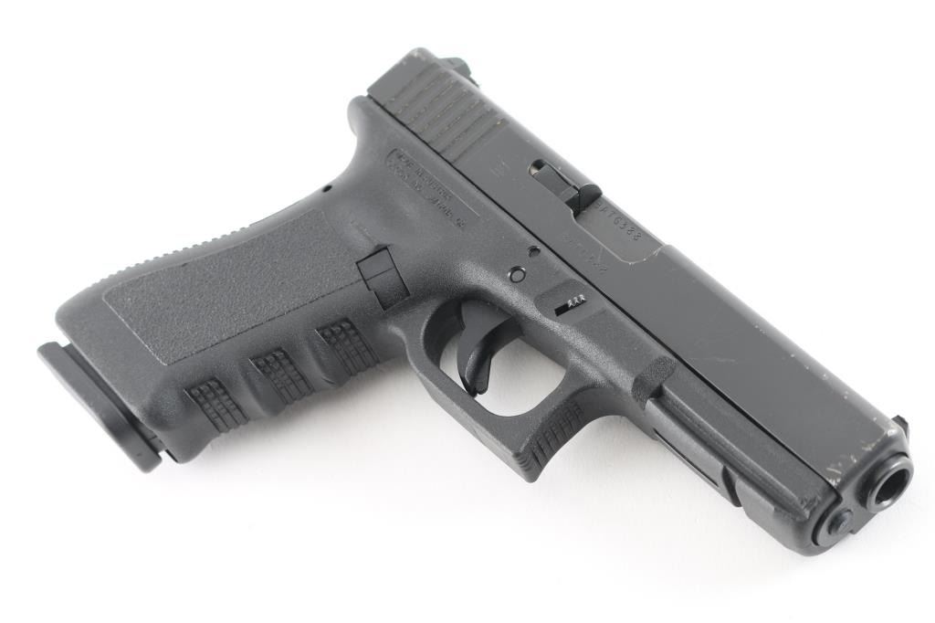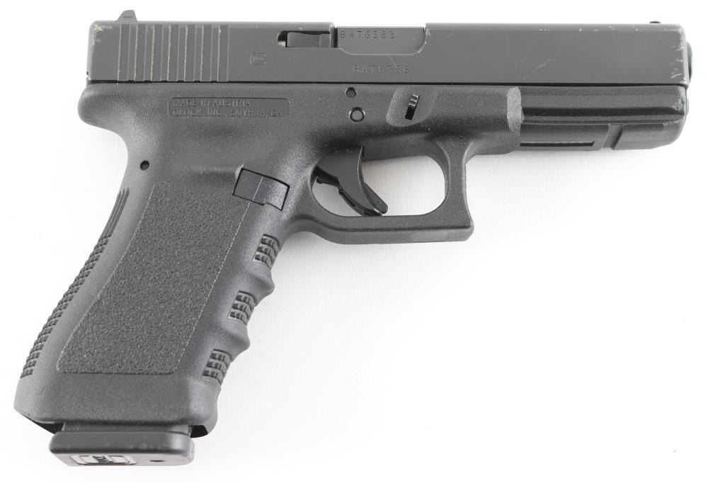 Austrian semiautomatic pistol. Features approx 4" barrel, fixed white dot front & drift adjustable white outline rear sights, striker fired, manual safety in trigger, polymer frame with accessory rail on dust cover & textured finger grooves in front strap. All black finish. Bore is excellent condition. Retains 90% finish on slide, with edge wear, scuffs to corners. Slide lock shows scuffing. Polymer is excellent. Includes one 15 rd magazine. Condition is NRA Very Good++ *** Modern Firearm ***