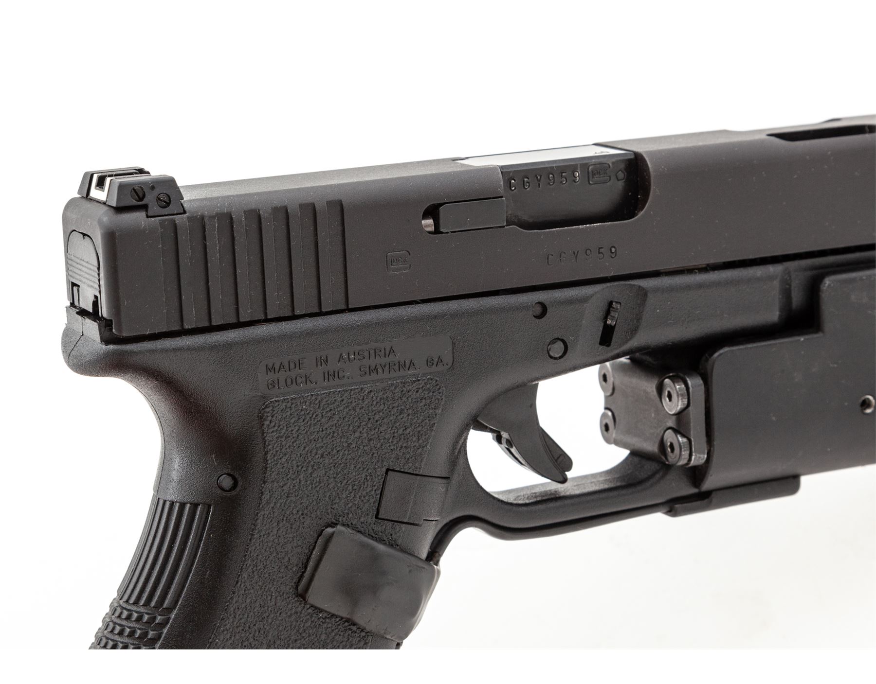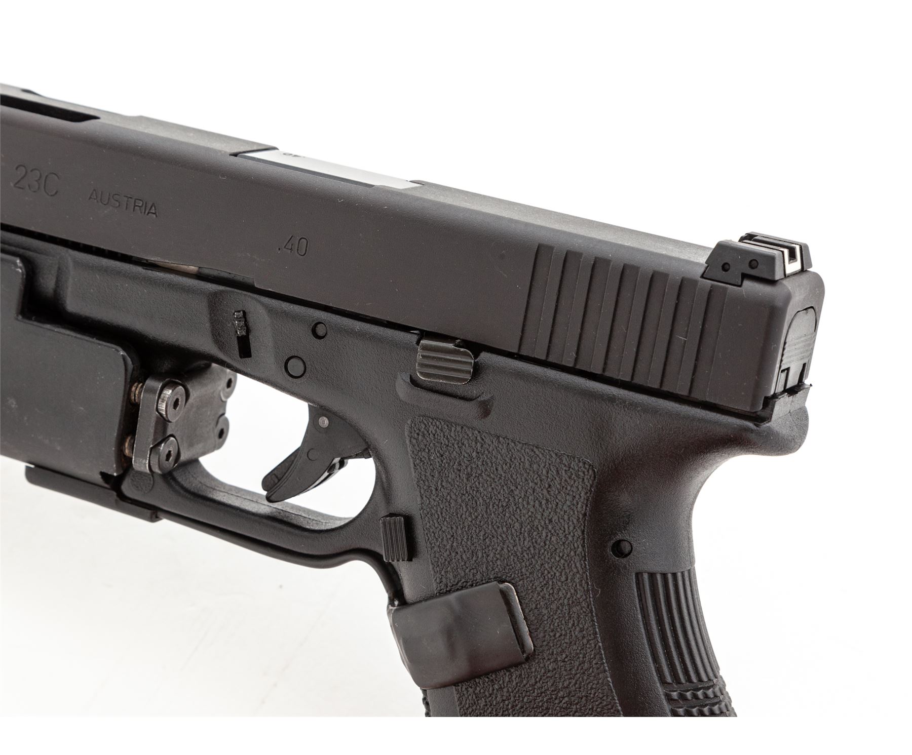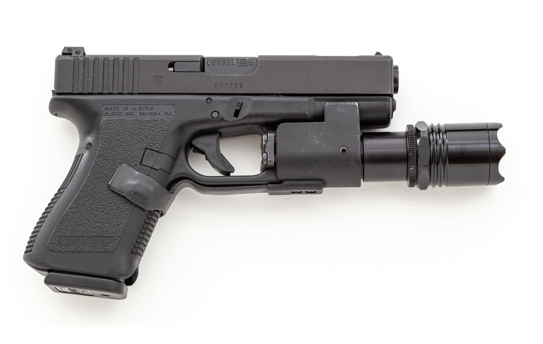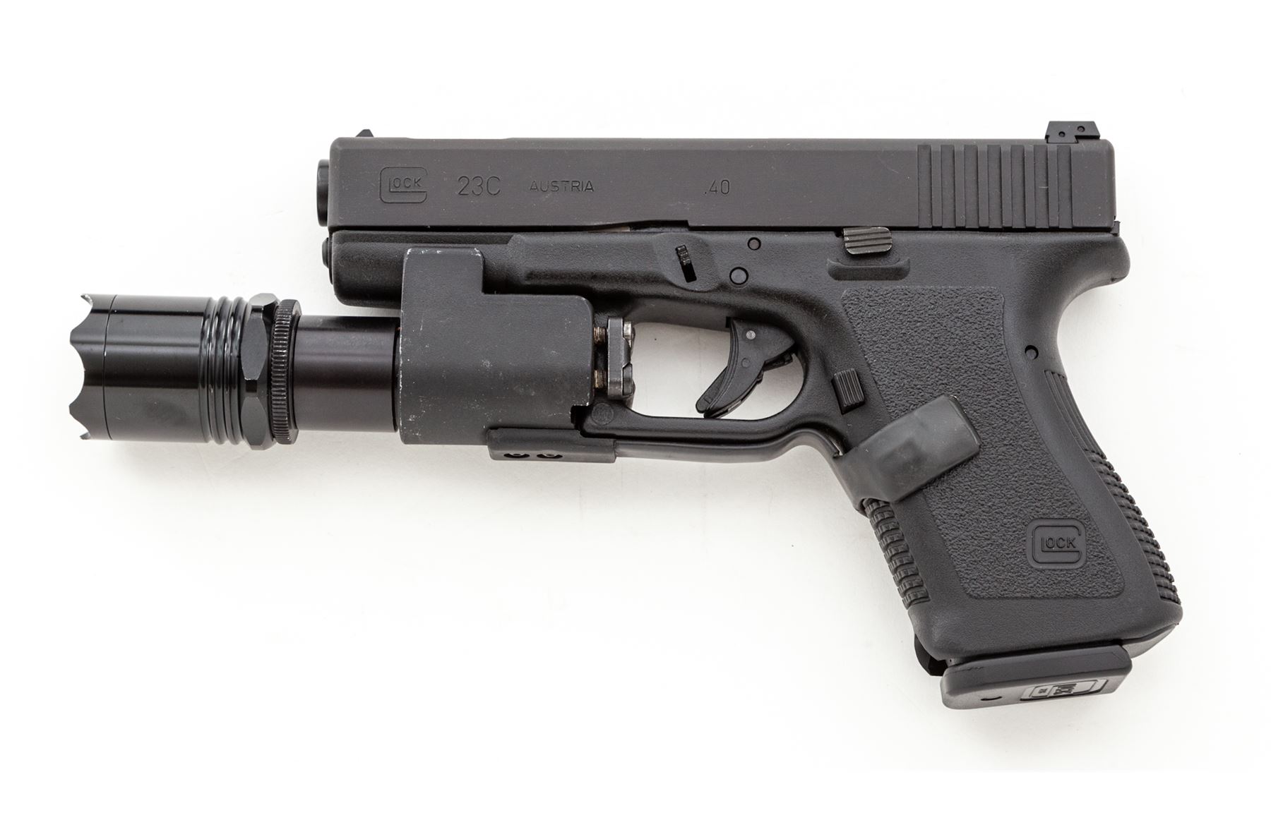 Glock Model 23C Semi-Automatic Pistol, #CGY959, .40 S&Wcal., 4'' ported barrel, matte finish, with two (2) 10-round magazines and two (2) 13-round magazines. Pistol additionally features a heavy duty tactical flashlight. All custom work by George DeLio. Barrel throat and chamber polished, angle and polish to feed ramp, action job is crisp with the trigger letting off right at 2.2 lbs. Condition is excellent appearing new and unused since its build in the mid 1990's. Est.: $450-$650. (Modern/PPT)(High-cap mags not available to Calif. residents.)