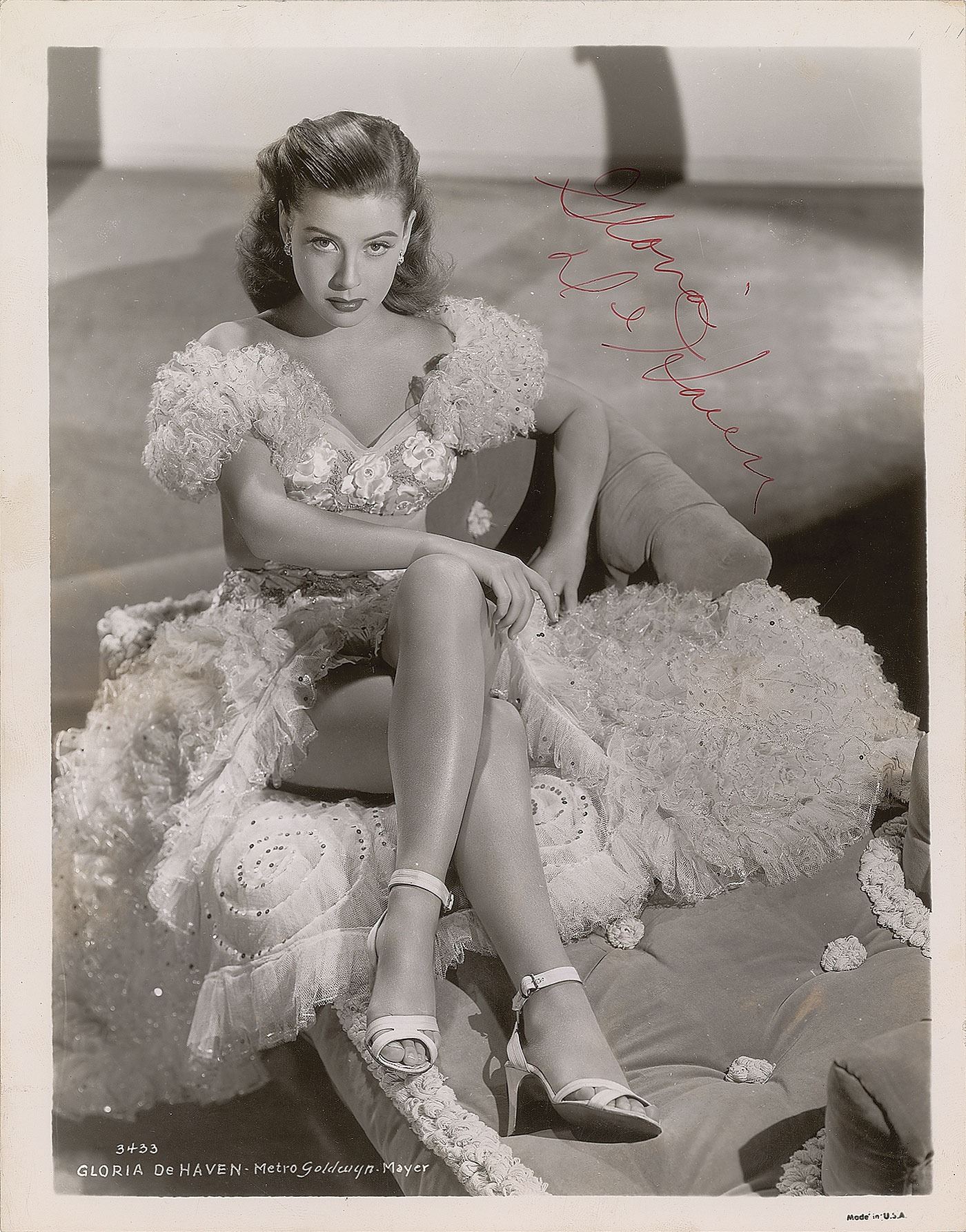 Very desirable vintage glossy 8 x 10 MGM publicity photo of DeHaven seated cross-legged and wearing an elaborate gown, signed in red fountain pen. In fine condition.