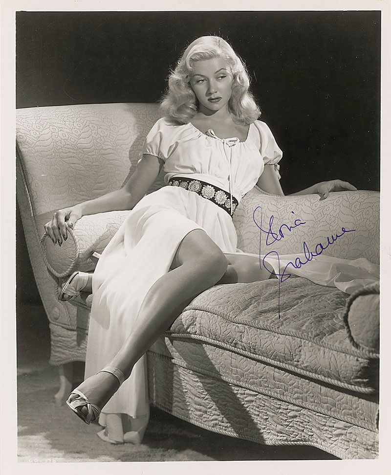 Alluring glossy 8 x 10 photo of Grahame seated with a bare leg seductively dangling off a couch, signed in purple felt tip. In fine condition.