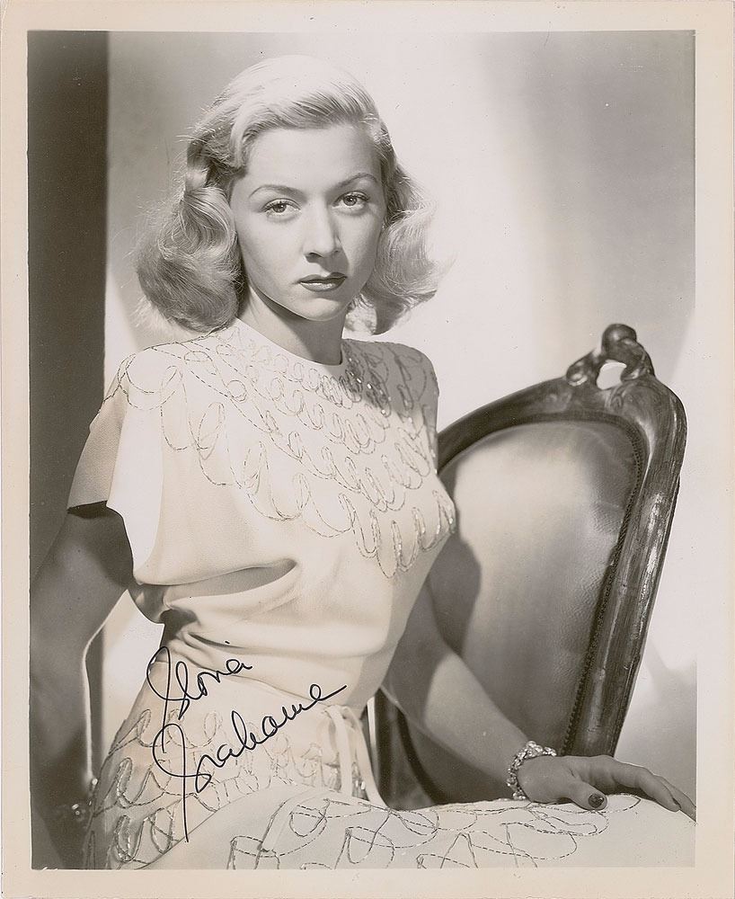 Beautiful glossy 8 x 10 photo of the film noir actress in an elegant gown, signed in black ink. In fine condition.