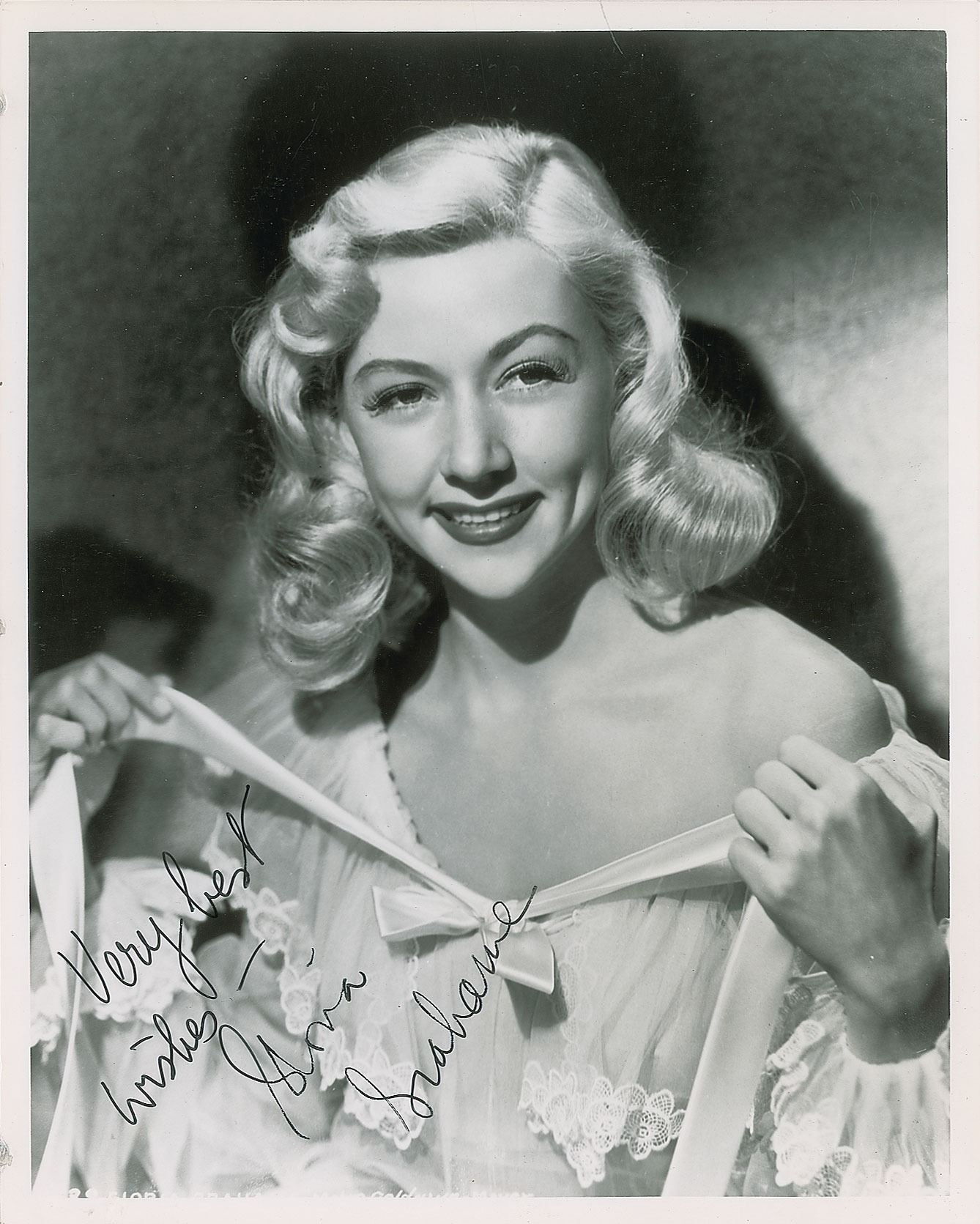 Glossy 8 x 10 photo of the Oscar-winning actress in a nightie, signed in black ink, "Very best wishes, Gloria Grahame." In fine condition, with a paperclip impression to the top edge and three binder dings to the left border. A particularly appealing, sexy photo of the 'femme fatale.'