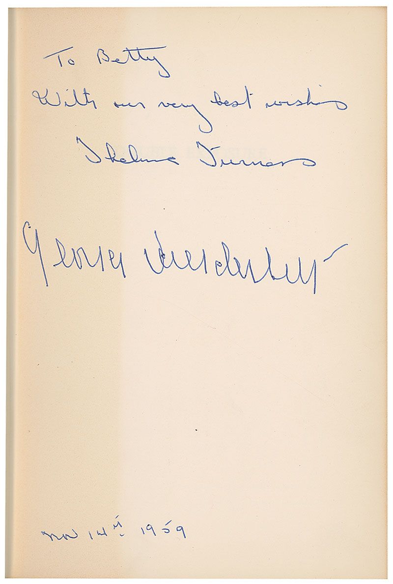 Vanderbilt (1904-1965) was a socialite and wife of Reginald Claypoole Vanderbilt, heir to his family’s fortune. She is best known as the mother of fashion designer and artist Gloria Vanderbilt. Furness (1904–1970) was her twin sister and the mistress of King Edward VIII—she introduced Edward to his future wife, Wallis Simpson. Signed book: Double Exposure. Second printing. NY: David McKay Company, 1958. Hardcover, 5.75 x 8.5, 369 pages. Signed on the first free end page in blue ballpoint, “Gloria Vanderbilt,” and signed and inscribed, “To Betty, with my very best wishes, Thelma Furness,” with the bottom of the page dated November 14, 1959. A block of toning to the left side of the signed page and a bookplate affixed to the front pastedown, otherwise fine condition.