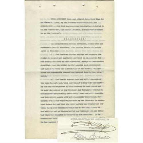 <B>Gloria Swanson and Louis B. Mayer Signed Contract.</B></I> A 24-page employment agreement between MGM and Gloria Swanson, dated January 22, 1934, signed by Swanson and Louis B. Mayer on the last page in black ink. A major star during the silent era, Swanson's career was in decline at that point and she only appeared in two films after this contract was signed up until her comeback performance in <I>Sunset Blvd.</B></I> (1950). The document is in Very Fine condition with mild wear and toning, and the usual binder holes to the top edges. <I>Accompanied by LOA from PSA/DNA.</B></I><BR><BR><b>Shipping:</b> Flat Material, Small (<a target="_blank" href="http://www.heritageauctions.com/common/shipping.php">view shipping information</a>)