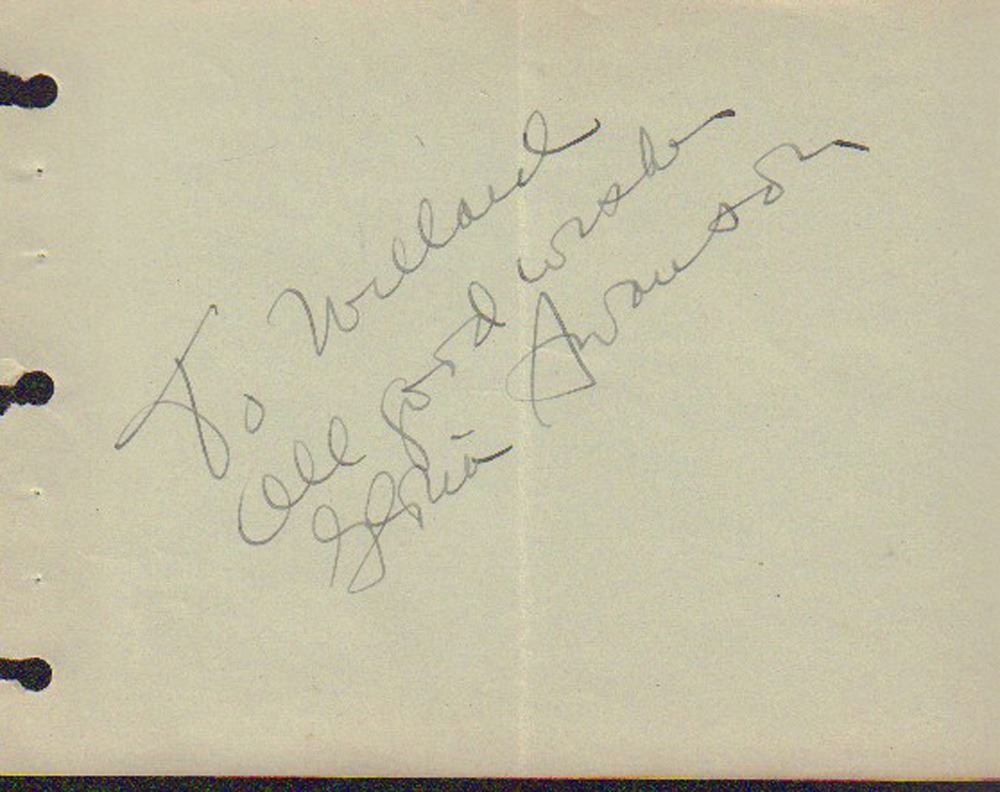 Autograph book page signed by Gloria Swanson. It was inscribed to Willard. The page had been folded in half at some point. All items come with a certificate of authenticity good for the life of the piece.