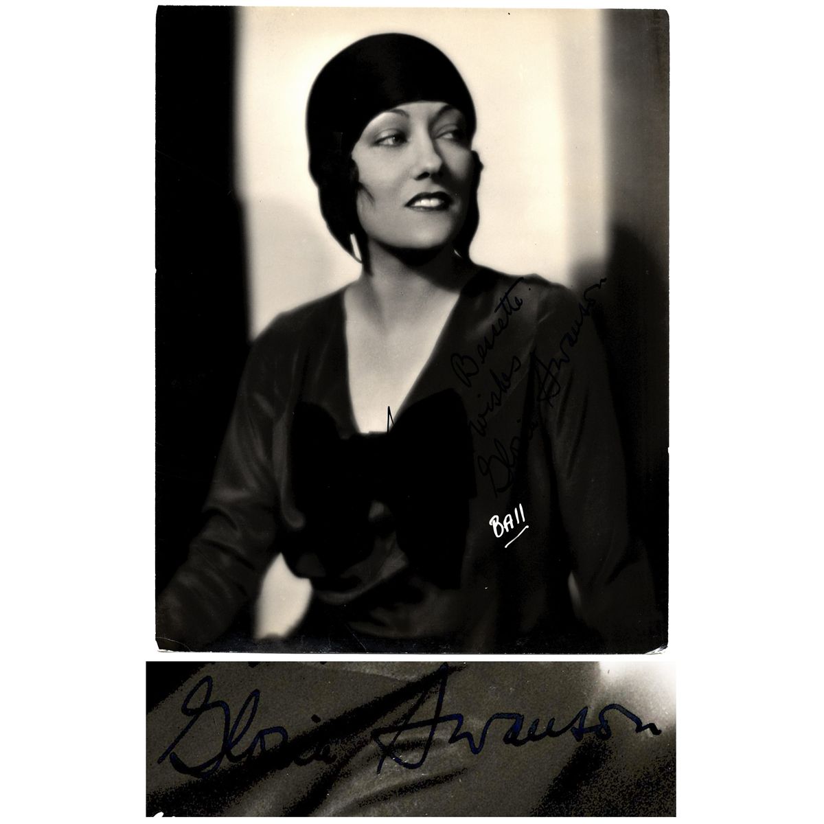 7.5'' x 9'' semi-matte photo signed ''Best wishes Gloria Swanson'' by the famed fashion icon and silent film star who was later known for her role as Norma Desmond in ''Sunset Boulevard.'' In the photo, which is also printed with the name of the photographer, Swanson holds a dog in her lap. Some creasing and toning at edges and diminished contrast to signature. Very good condition.