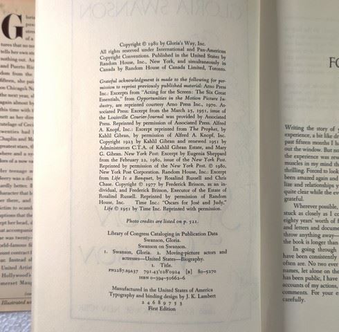 Swanson on Swanson, an Autobiography (Random House, 1980) hard cover book, written and signed by Gloria Swanson. 519 pages.
