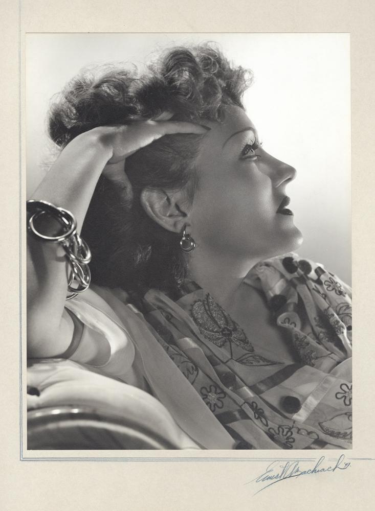 Silver bromide matte borderless 10- ¼ x 13- ¼ in. (on 15 x 20 in. 4-ply board mount) exhibition print of Gloria Swanson by Ernest A. Bachrach; with photographer signature Ernest A. Bachrach `41 in graphite on the mount recto. From the personal collection of the photographer. Excellent.