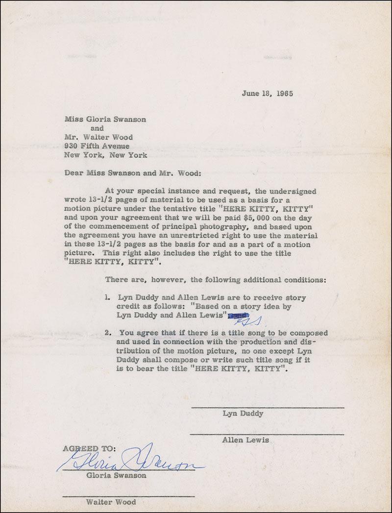 DS, signed “Gloria Swanson,” one onionskin page, 8.5 x 11, June 18, 1965. Acknowledgment of “13-1/2 pages of material to be used as a basis for a motion picture under the tentative title ‘HERE KITTY, KITTY’ and upon your agreement that we will be paid $5,000 on the day of the commencement of principal photography, and based upon the agreement you have an unrestricted right to use the material…as the basis for and as a part of a motion picture.” In fine condition, with scattered creasing.
