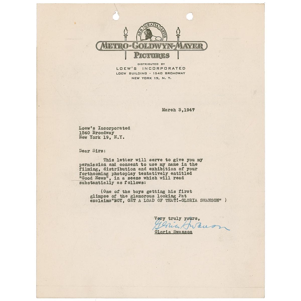 DS, one page, 8.5 x 11, March 3, 1947. Swanson grants Loew’s Incorporated permission to use her name in a future scene, in full: “This letter will serve to give you my permission and consent to use my name in the filming, distribution and exhibition of your forthcoming photoplay tentatively entitled ‘Good News’, in a scene which will read substantially as follows: (One of the boys getting his first glimpse of the glamorous looking Pat exclaims ‘BOY, GET A LOAD OF THAT! –GLORIA SWANSON’).” In fine condition, with scattered light creasing, with a horizontal crease running the length of the bottom edge, and two binder holes at the top edge.