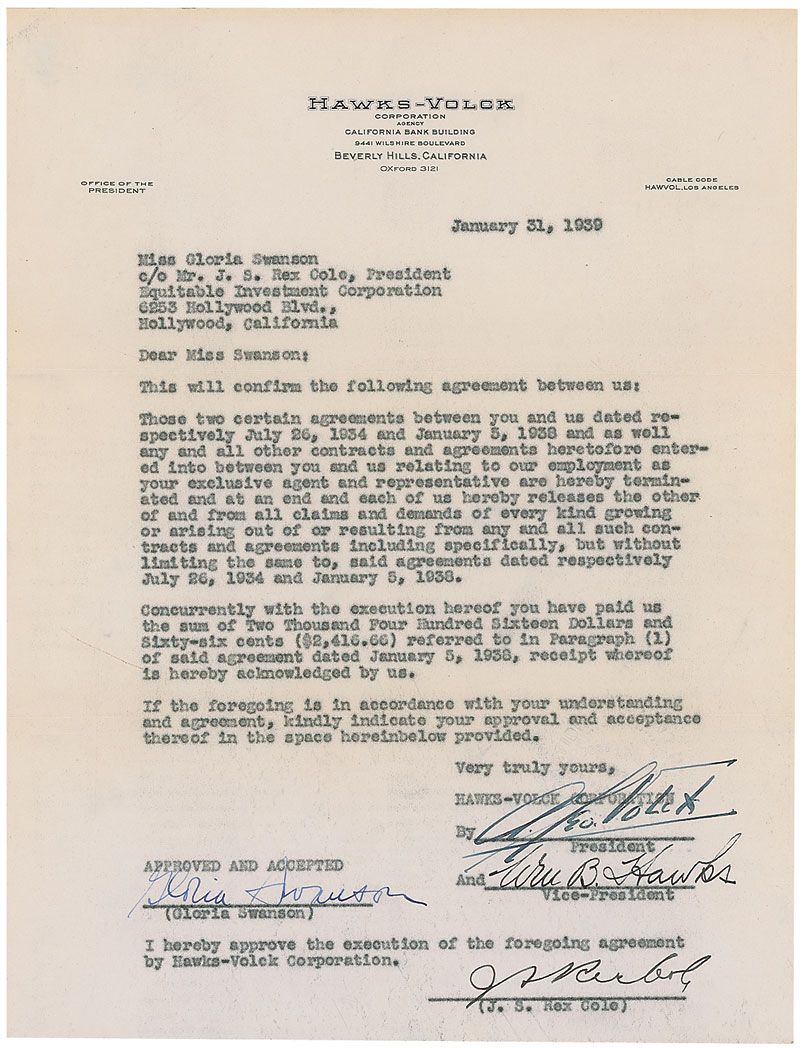 DS, one page, 8.5 x 11, January 31, 1939. Agreement between Swanson and the Hawks-Volck Corporation terminating an agreement, with Swanson paying the corporation back $2,416.66. Signed at the bottom by Swanson, the Hawks-Volck president and vice president, and J. S. Rex Cole. In fine condition.