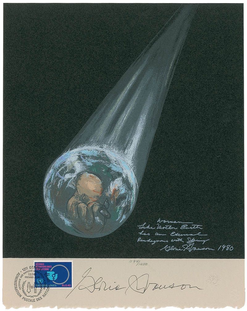 Color limited edition 8.5 x 10.75 serigraph print entitled Decade for Women, numbered #1194/1250 signed in the lower border in pencil. This design by Swanson was used by the United Nations in its ‘Decade for Women’ campaign, and a stamp honoring the UN is affixed to the lower border. In very fine condition.