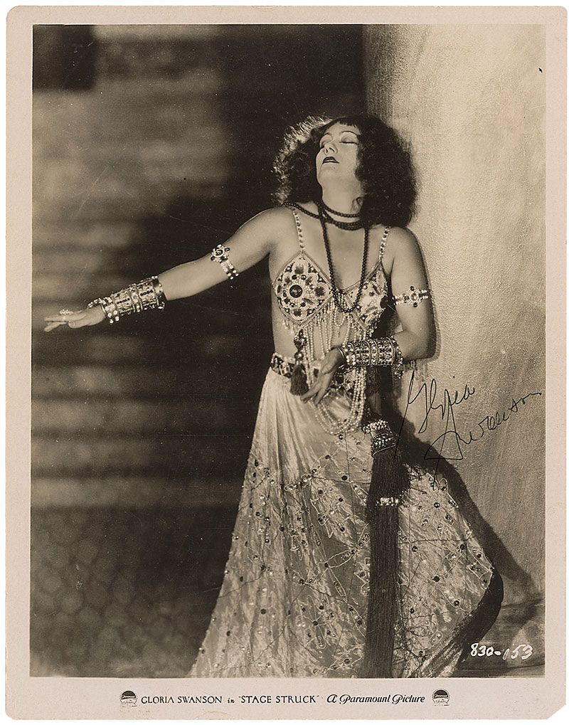 Vintage glossy 8 x 10 Paramount Pictures publicity photo of Swanson in Stage Struck, signed in black ink. Some scattered creasing and clipped lower right corner tip, otherwise fine condition.