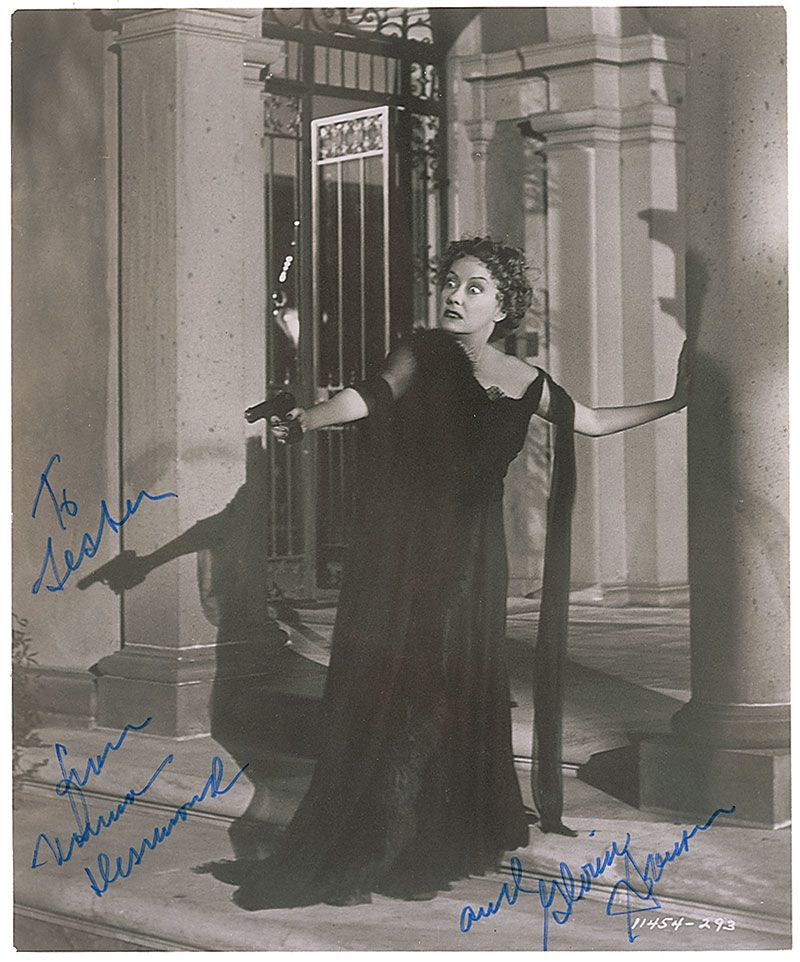 Glossy 7.25 x 9 photo of Swanson as Norma Desmond in a dramatic scene from Sunset Boulevard, signed and inscribed in blue felt tip, “To Lester, from Norma Desmond and Gloria Swanson.” In fine condition, with edges likely trimmed.