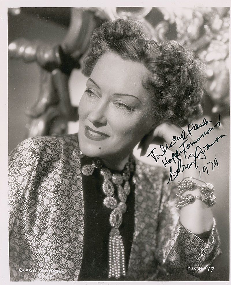 Glossy 8 x 10 photo, signed and inscribed in black felt tip to Ira and Paula Kramer of Movie Star News, “To Ira and Paula, Happy tomorrows! Gloria Swanson 1979.” In fine condition.