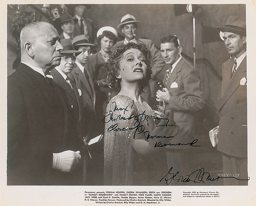 Vintage glossy 10 x 8 Paramount promotional photo from Sunset Boulevard, signed and inscribed later in black felt tip, “‘Max, I’m ready for my close up’—Norma Desmond, Gloria Swanson.” In fine condition, with some scattered light creases and surface marks, and a bit of irregular ink adhesion to first name of signature. Consignor notes photo originates from the Greenwich Village estate of John P. Sullivan. A very uncommon combination with Swanson, adding her most famous quote, referencing Erich von Stroheim’s famous character, as well as signing her character name.