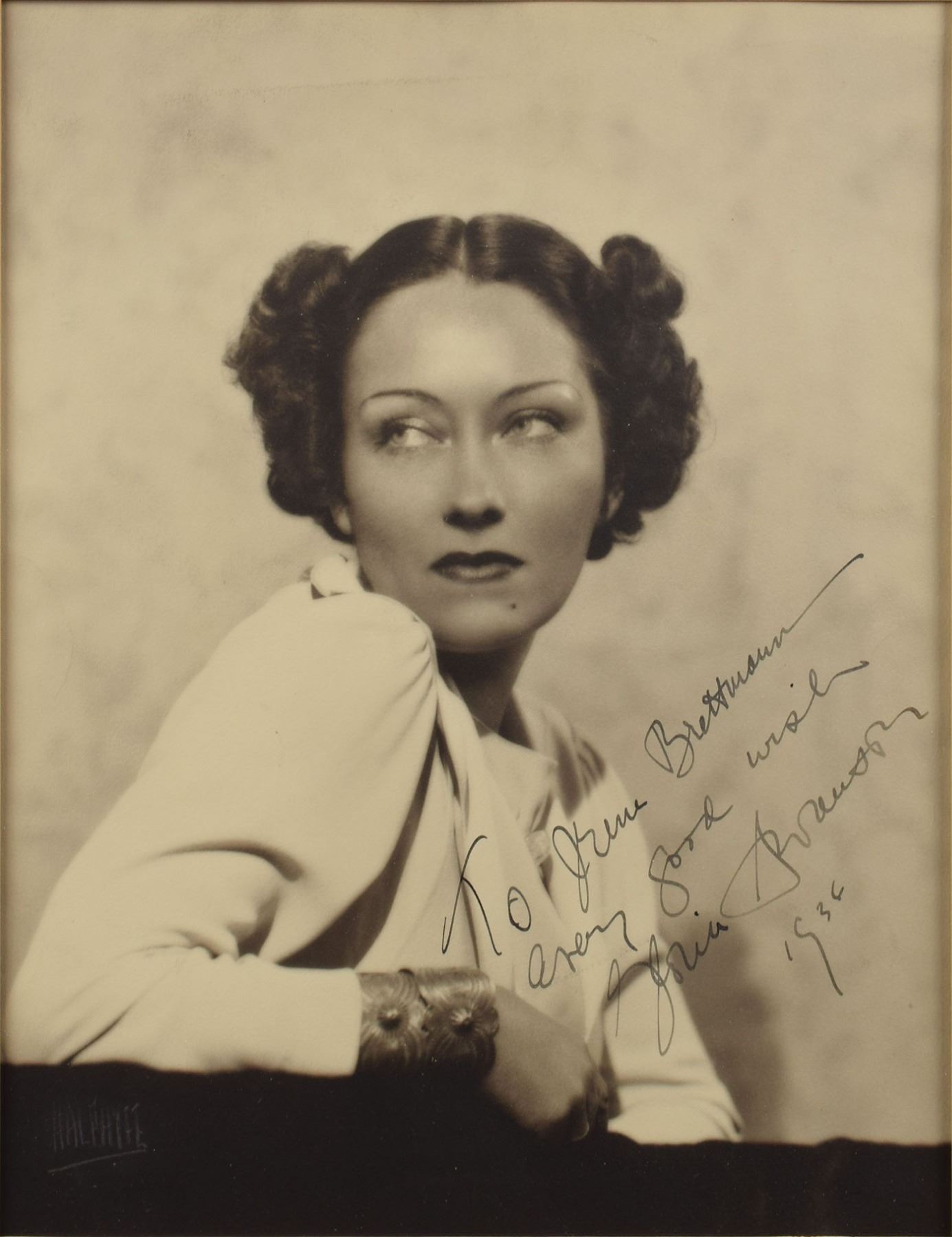 Vintage matte-finish 9.25 x 12 portrait of Swanson by photographer Hal Phyfe, signed and inscribed in fountain pen, "To Irene Brettmann, every good wish, Gloria Swanson, 1936.” Also signed in the lower left corner in graphite by Phyfe. Double-matted and framed to an overall size of 15.75 x 18.25. In fine condition.