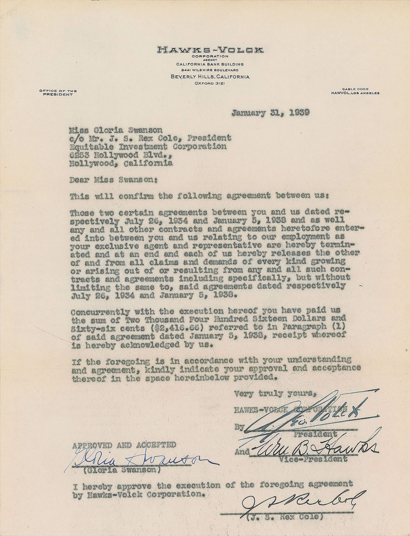 DS, one page, 8.5 x 11, January 31, 1939. Agreement between Swanson and the Hawks-Volck Corporation terminating an agreement, with Swanson paying the corporation back $2,416.66. Signed at the bottom by Swanson, the Hawks-Volck president and vice president, and J. S. Rex Cole. In fine condition.
