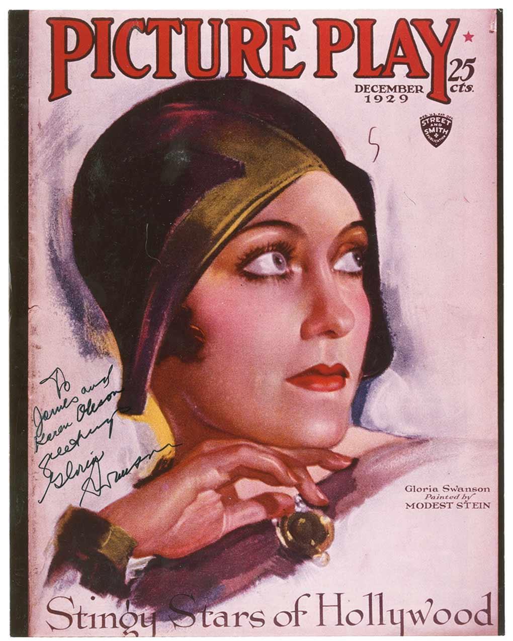 Color glossy 8 x 10 photo of the cover of the December, 1929 issue of Picture Play, signed and inscribed in black felt tip “To James and Karen Oleson, Greetings, Gloria Swanson.” In fine condition.